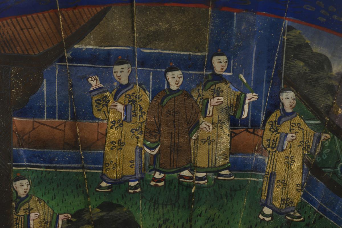 Breite, geschweifte Stäbe aus schwarzem Lack, figürlich bemalt. Oberer Teil aus Papier mit farbkräftiger Malerei. Altersspuren.