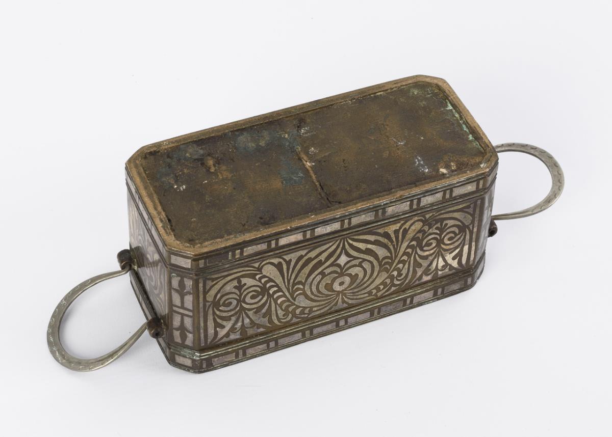 Bronze, Silbereinlagen (geprüft), Metallgriffe. 9 x 18,5 x 8,5 cm.