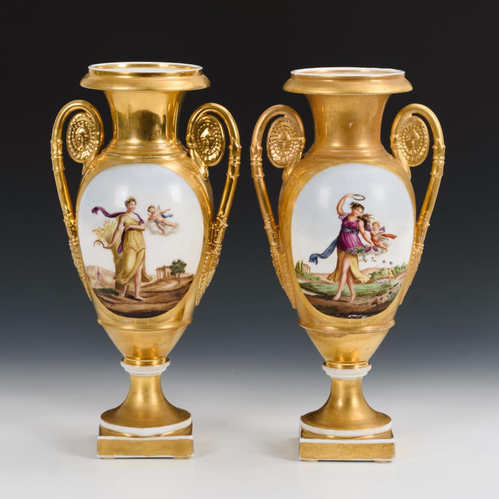 Ovoider Korpus mit zwei Maskaronhenkeln, Kraterhals, Rundfuß, auf Quadratplinthe. Goldfond, schauseitig ein Ovalmedaillon mit Jahreszeitendarstellungen (Frühling und Sommer). Gold etwas berieben und teilweise retuschiert, 1 Henkel restauriert.