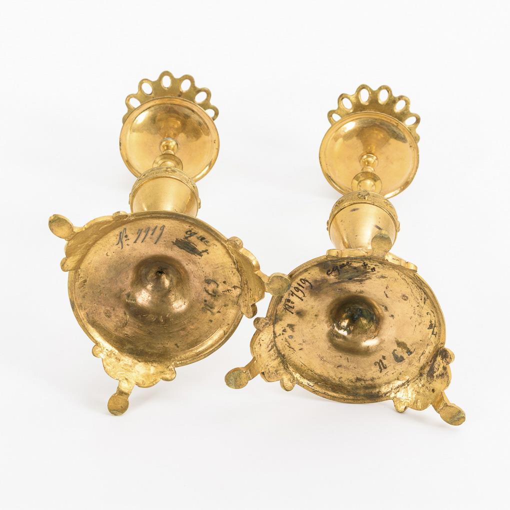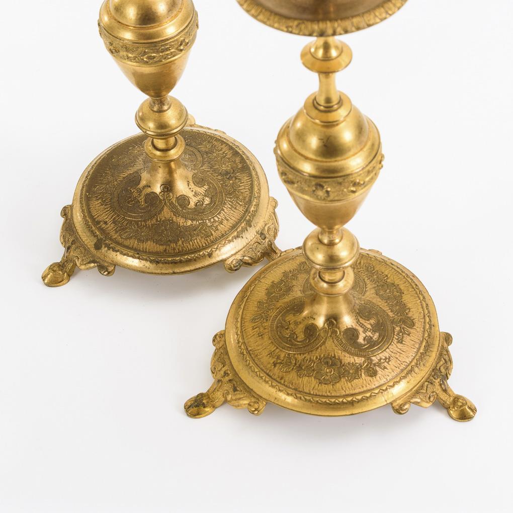 Schlanke Bronzeleuchter mit Ornamentgravur auf dem Fuß und vasenartigem Balusterschaft. Teils berieben.