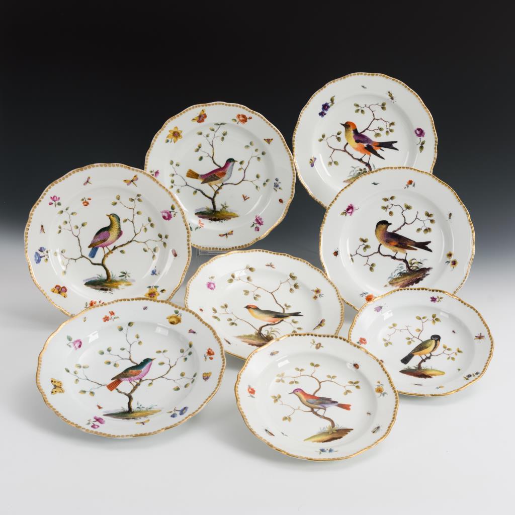 6 Speiseteller und 2 Salatteller mit gewelltem Rand. Im Spiegel ein im Baum sitzender Vogel, auf der Fahne Streublümchen und Insekten . Partieller Goldabrieb.