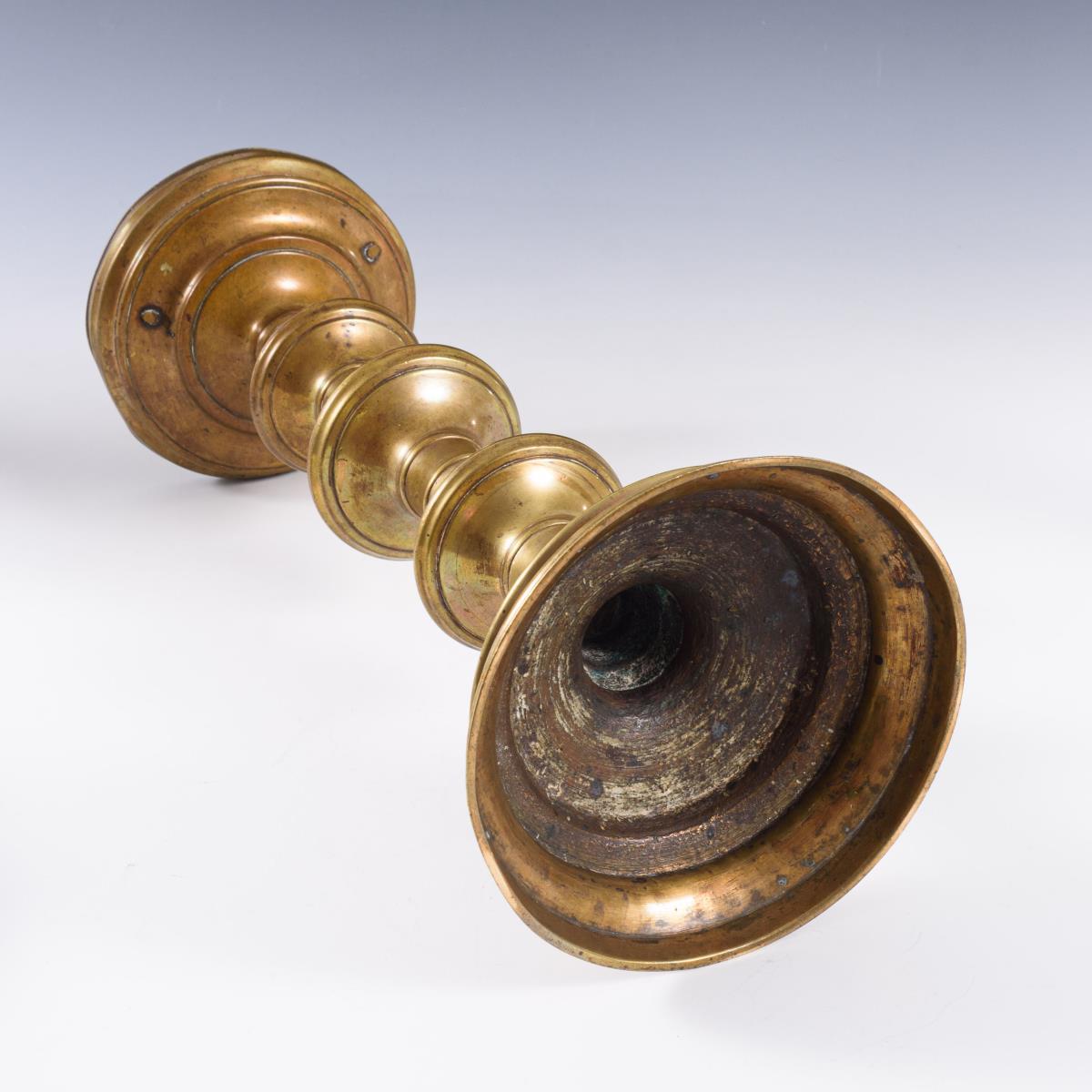 Massiv gegossener, großer Kerzenleuchter mit 3 Wirteln am Schaft. Wachsteller verbogen, sonst wenige Alters-/Gebrauchsspuren.
