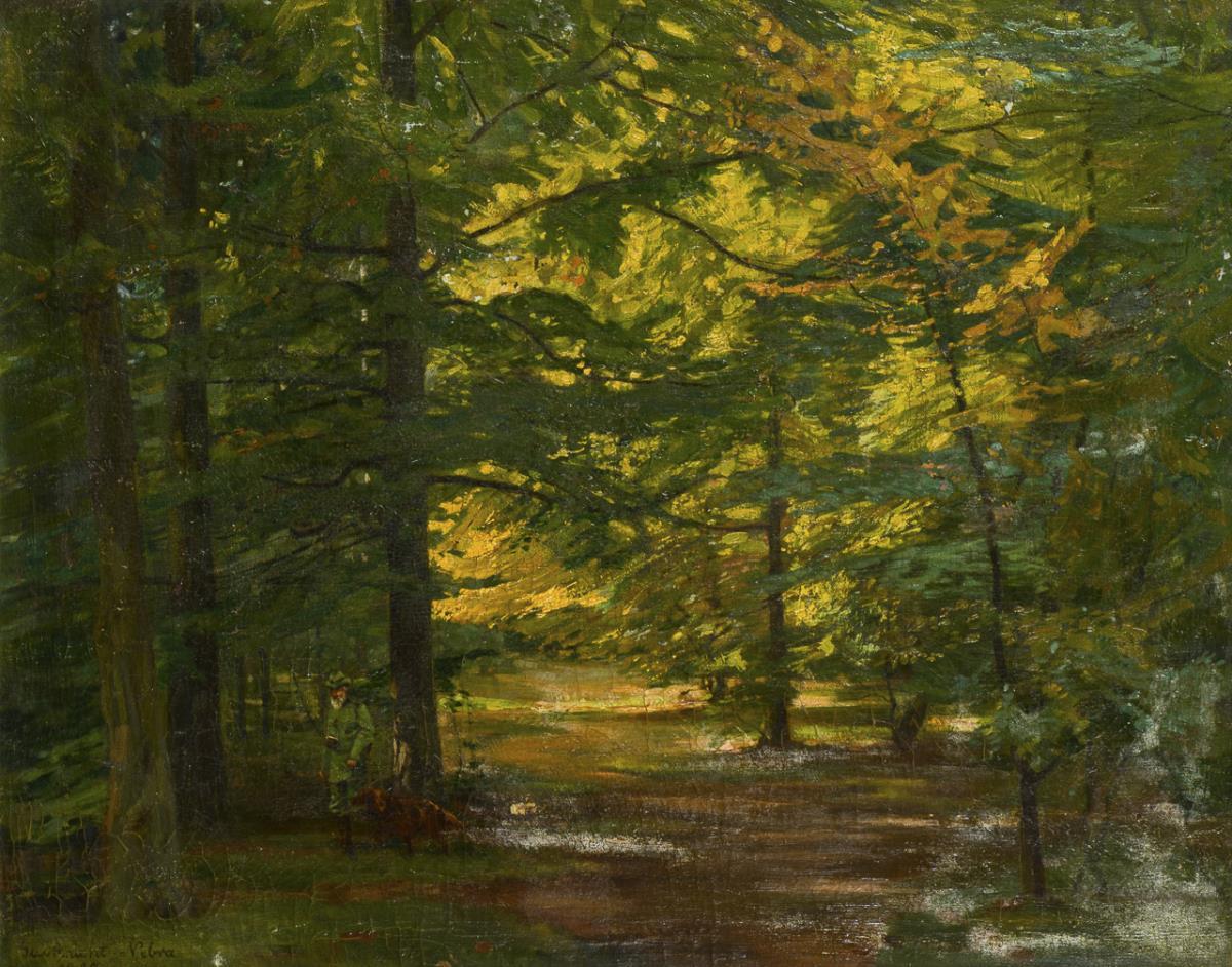 Alter Jäger im Schatten der Bäume an einem Bach. Ein Defekt, eine restaurierte Stelle mit Hinterklebung.