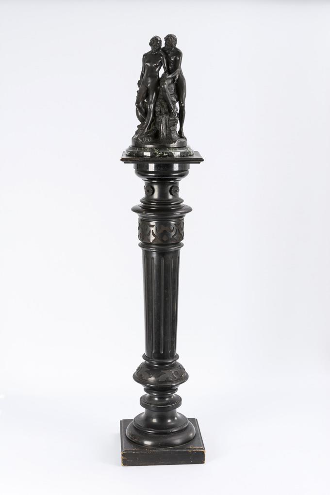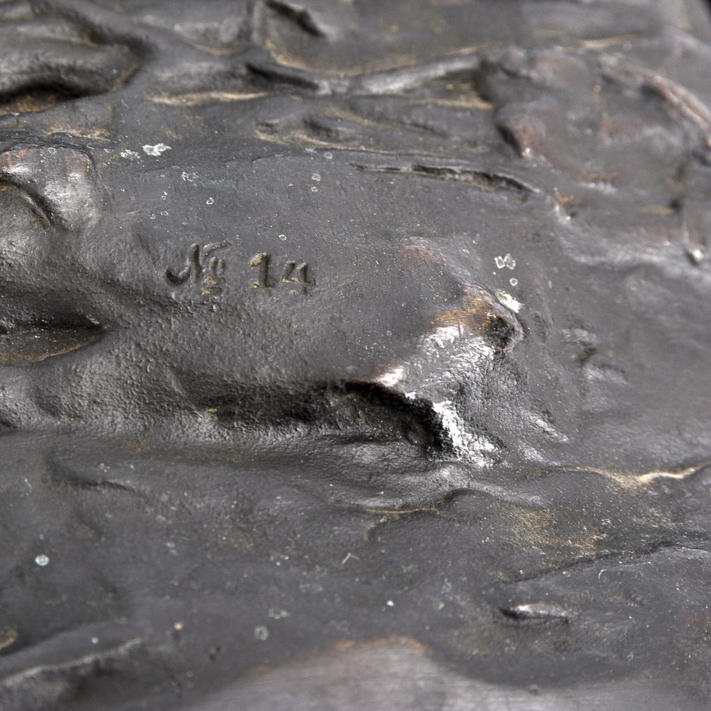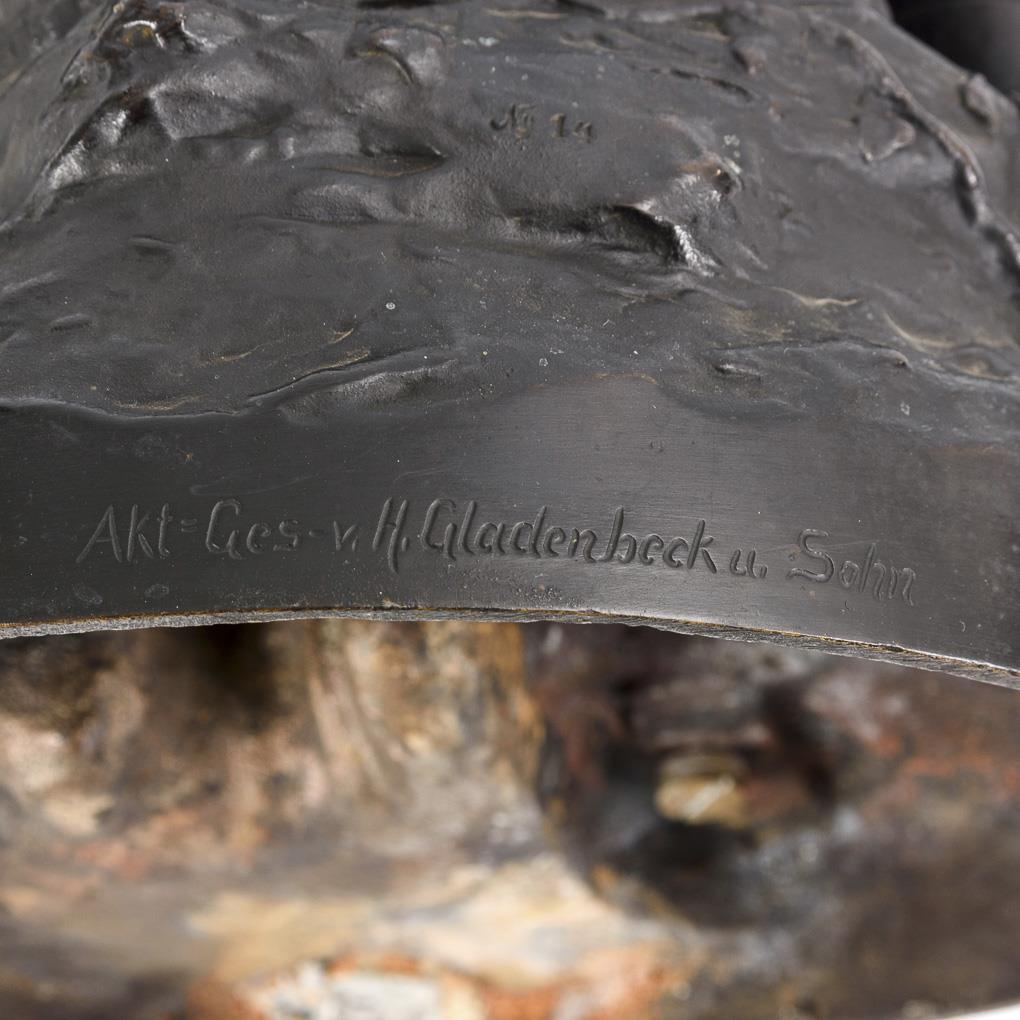 Bronze schwarz patiniert, dunkelgrüne Marmor-Plinthe, ebonisierte Holzsäule mit Verzierungen. "Boelzig" bezeichnet mit Zählung "Nr. 14", Gießermarke "Akt=Ges-v. H. Gladenbeck & Sohn". H 37 / 40 cm + Säule 108 cm.