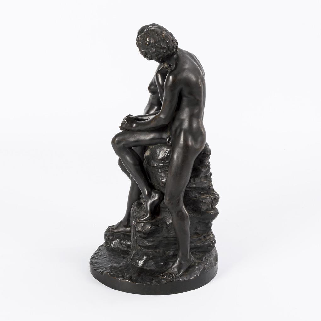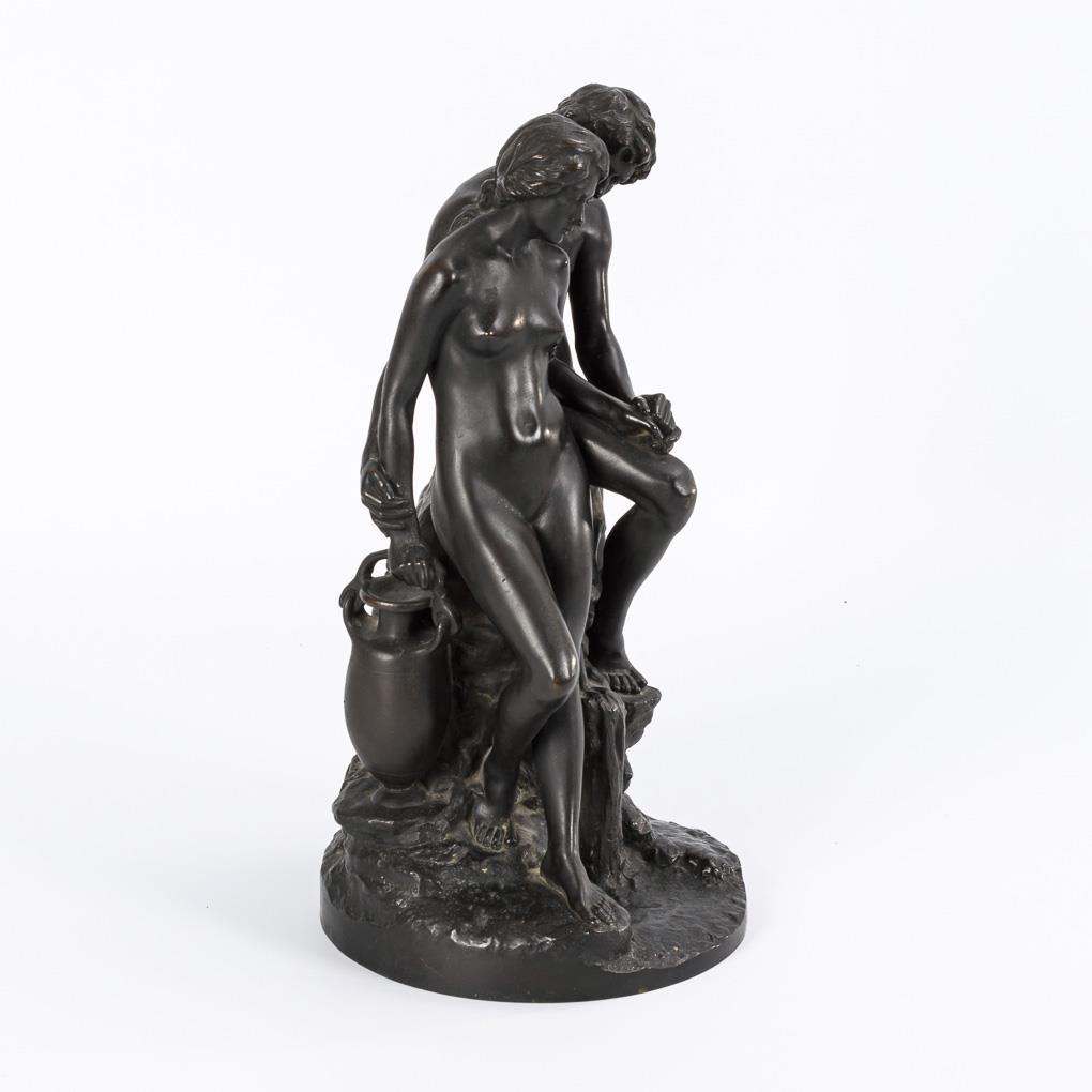 Nacktes Paar in zarter Annäherung an einer Quelle. Einige Alters-/Gebrauchsspuren, lose Plinthe.