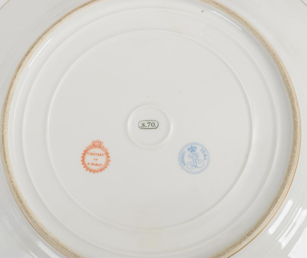 Louis Philippe, ein großer Förderer der Manufaktur Sèvres, bestellte dort 1836 ein Speiseservice für das Schloss in Fontainebleau, welches von 1839-1847 geliefert wurde. Das Rankenwerk auf der Fahne bezieht sich dabei auf die nahegelegenen, umfangreichen Waldgebiete, während die Tiere in dem Blattwerk auf die Jagd anspielen, für die das Schloss berühmt war.