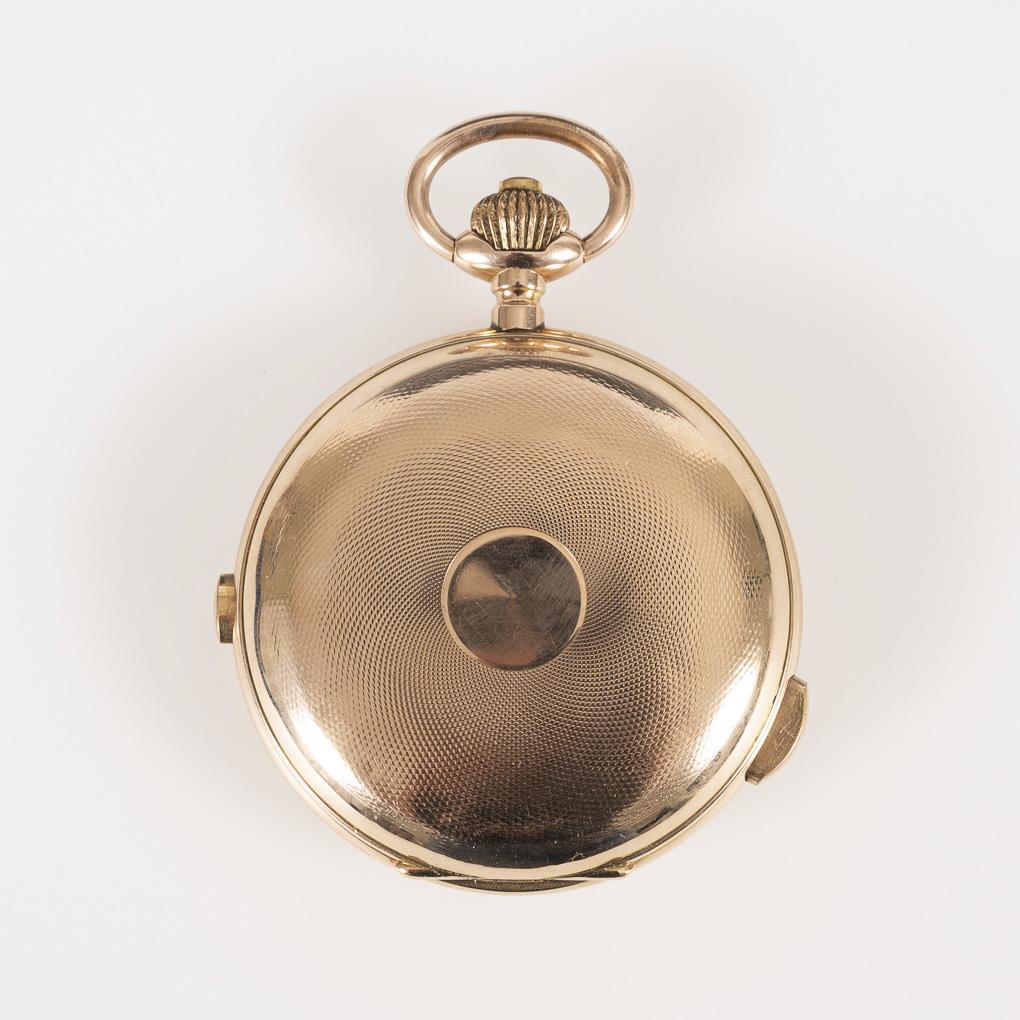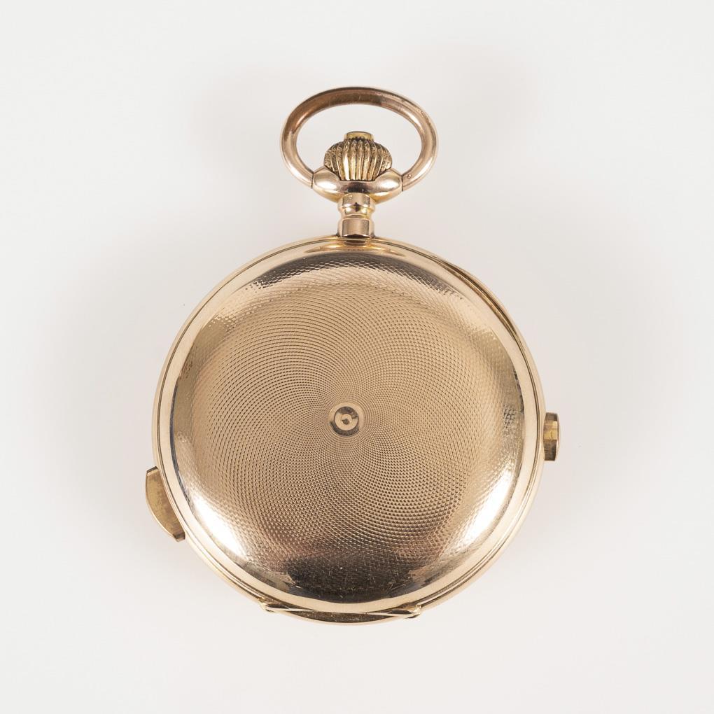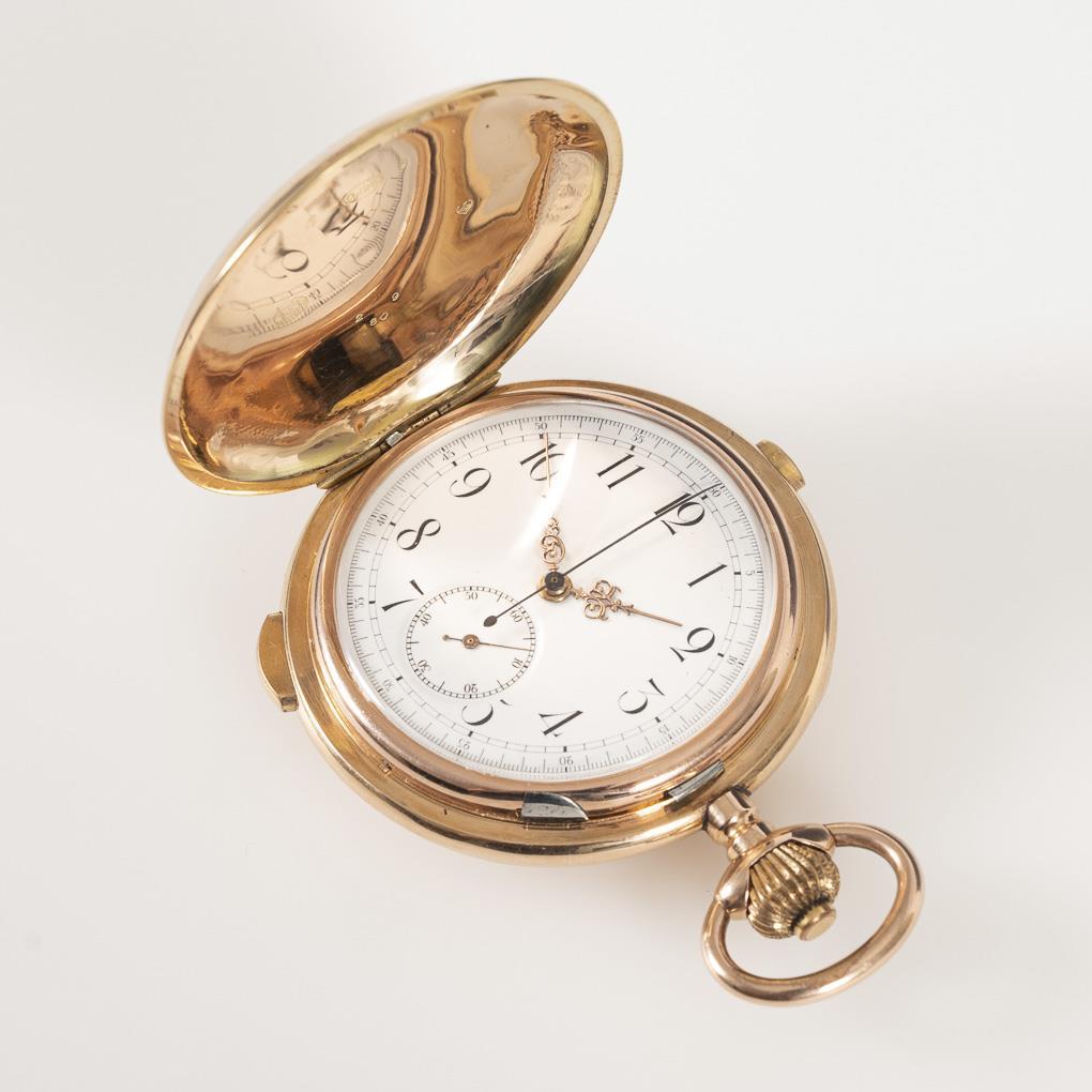 Goldene Savonnette mit Viertelstundenrepetition und Stoppuhr.