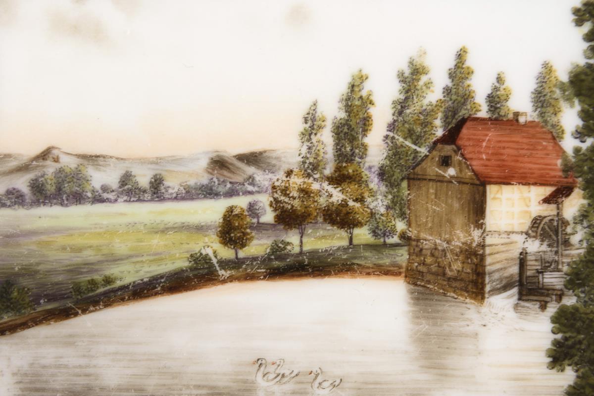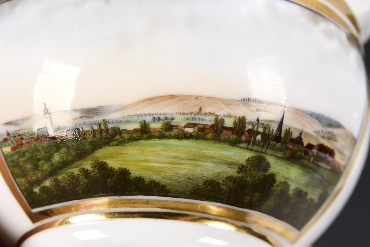Gefußte Glockentasse mit Palmettenhenkel. Schauseitig auf der Tasse sowie im Spiegel der Untertasse eine goldgerahmte Rechteckkartusche mit der Darstellung einer Stadtvedute (Tasse) bzw. eines Flusses mit Mühle. Henkel und Mündungsrand der Tasse sowie und Untertassenrand restauriert.