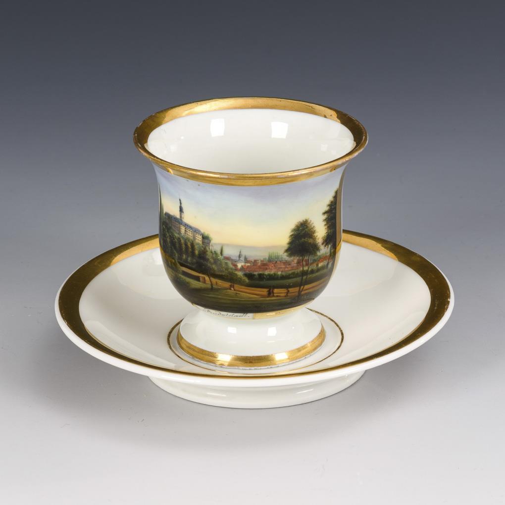 Gefußte Glockentasse mit spitz geschweiftem Henkel. Schauseitig eine goldgerahmte Rechteckkartusche mit der bezeichneten Ansicht der Stadt Rudolstadt mit Blick auf die Heidecksburg. 2 minimale Chips am Fuß.