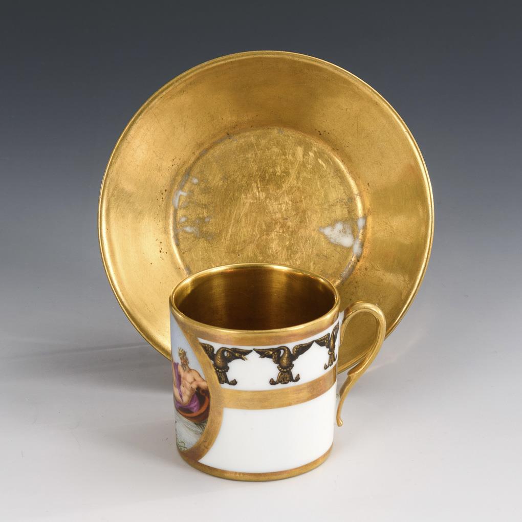 Zylindertasse mit Ohrenhenkel. Schauseitig ein goldgerahmtes Medaillon mit der Darstellung des Gottes Neptun auf einem von Pferden gezogenen Wagen, innen vergoldet. Partieller Goldabrieb.