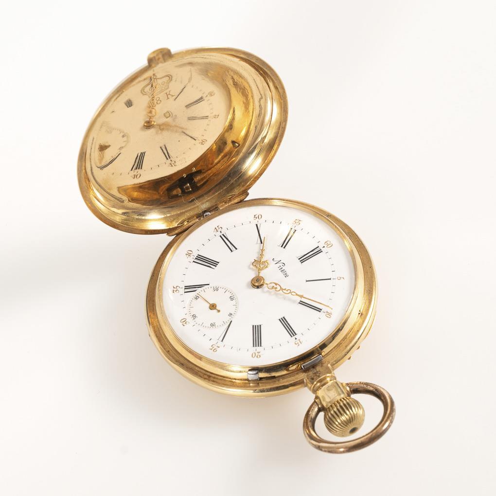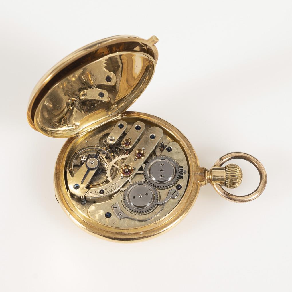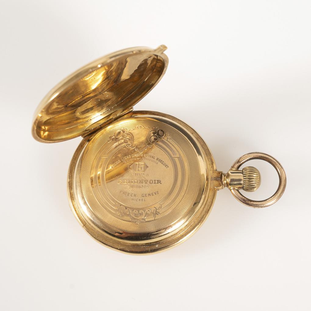 18 kt gepunzt, mit Schweizer Beschauzeichen Helvetia, Kronenmarke, goldener Staubdeckel, bezeichnet "Pateck Geneve Nickel". Ø 5,2 cm. Gesamt 101 g (Goldgewicht 39,5 g).