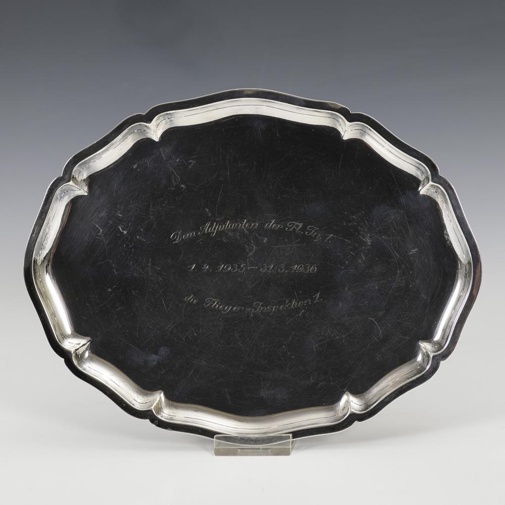 Kleines Silbertablett mit geschweiftem Rand und Widmungsgravur: "Dem Adjuntanten der Fl. In. 1, die Flieger-Inspektion 1. - 1.4. 1935 - 31.3. 1936". Leicht verkratzt.