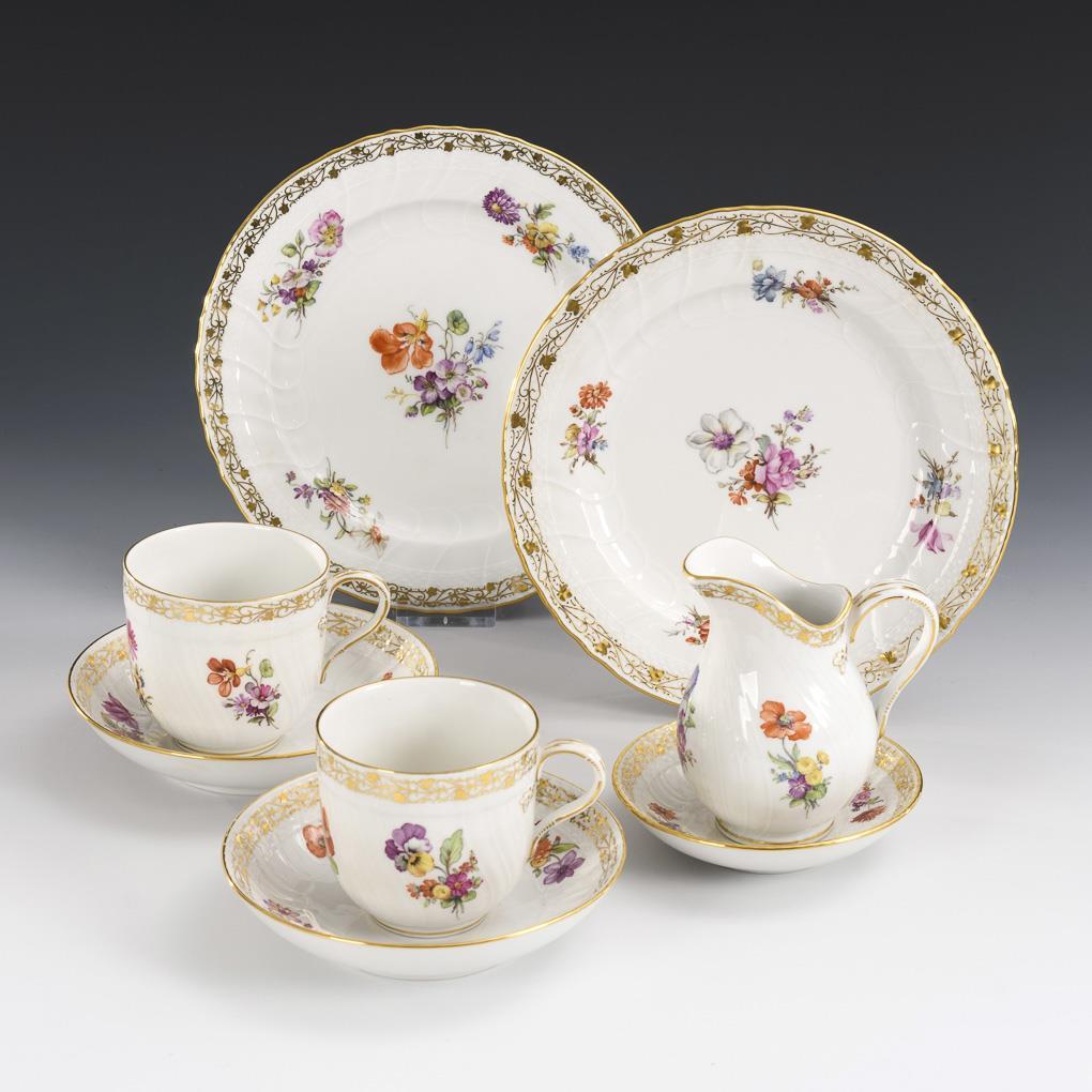 Modell Neuozier, mit Blumenmalerei. 2 Tassen (H 7,2 cm), 2 UT (Ø 14 cm), 2 Kuchenteller (Ø 20 cm), Kännchen (H 10,5 cm) und 1 Unterschälchen (Ø 11,2 cm).