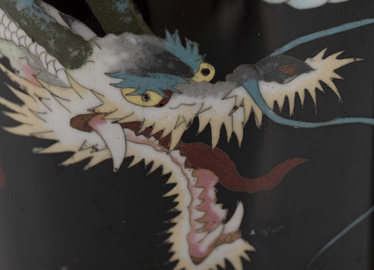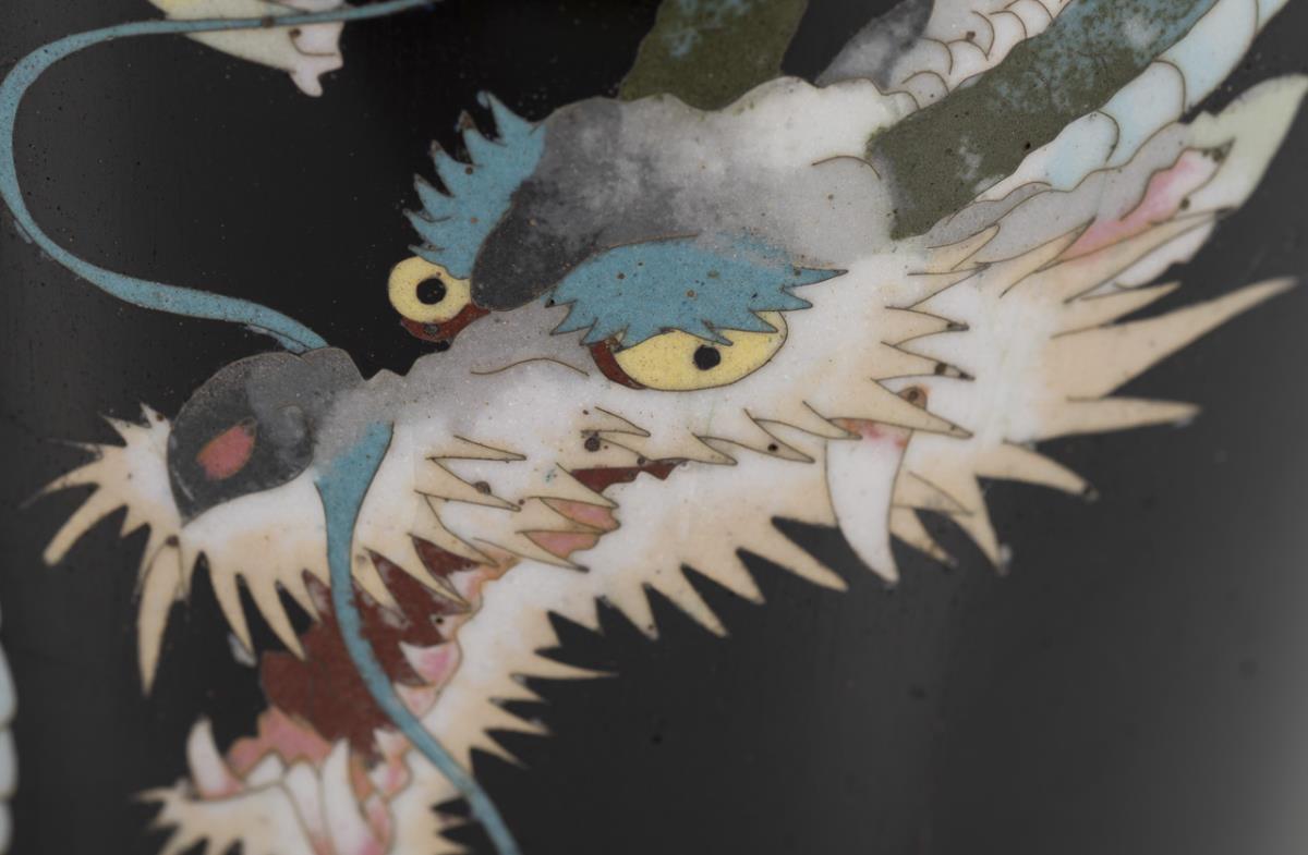 2 schwarze Cloisonnévasen mit weißen Drachen.