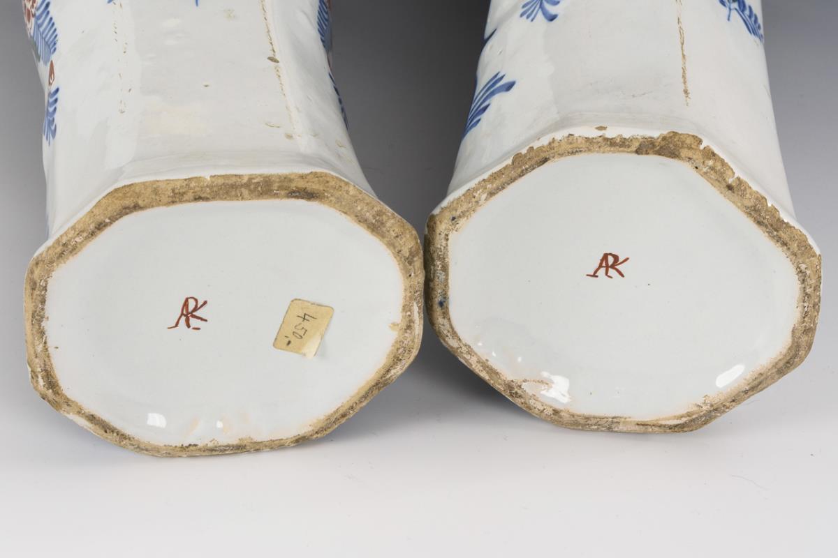 Paar barocke Fayence-Stangenvasen mit Vogel- und Blumenmalerei.