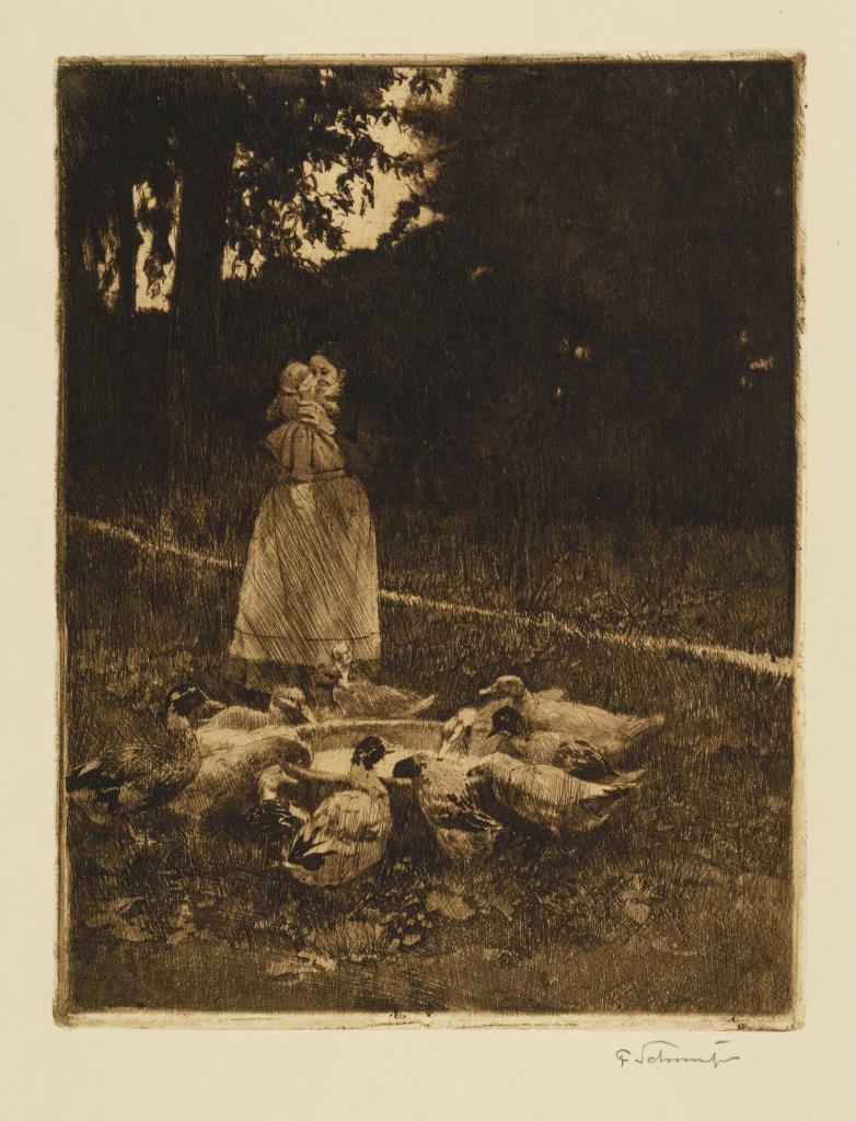 Mutter mit Kind beim Enten füttern und Hirte mit Schafen. Etwas geknickt und verschmutzt.