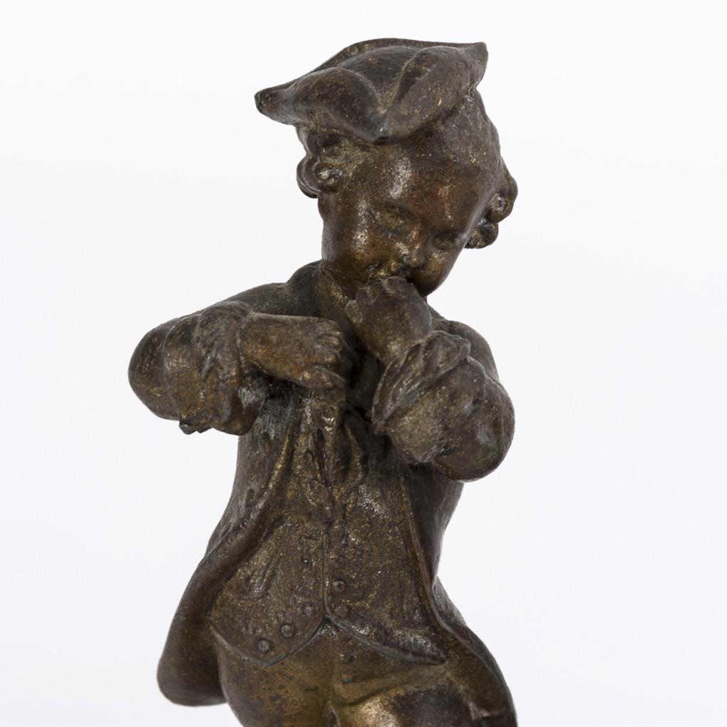 Metallguss bronzefarben patiniert, ebonierte Holzsockel. Um 1900. H 15 / 18 cm.