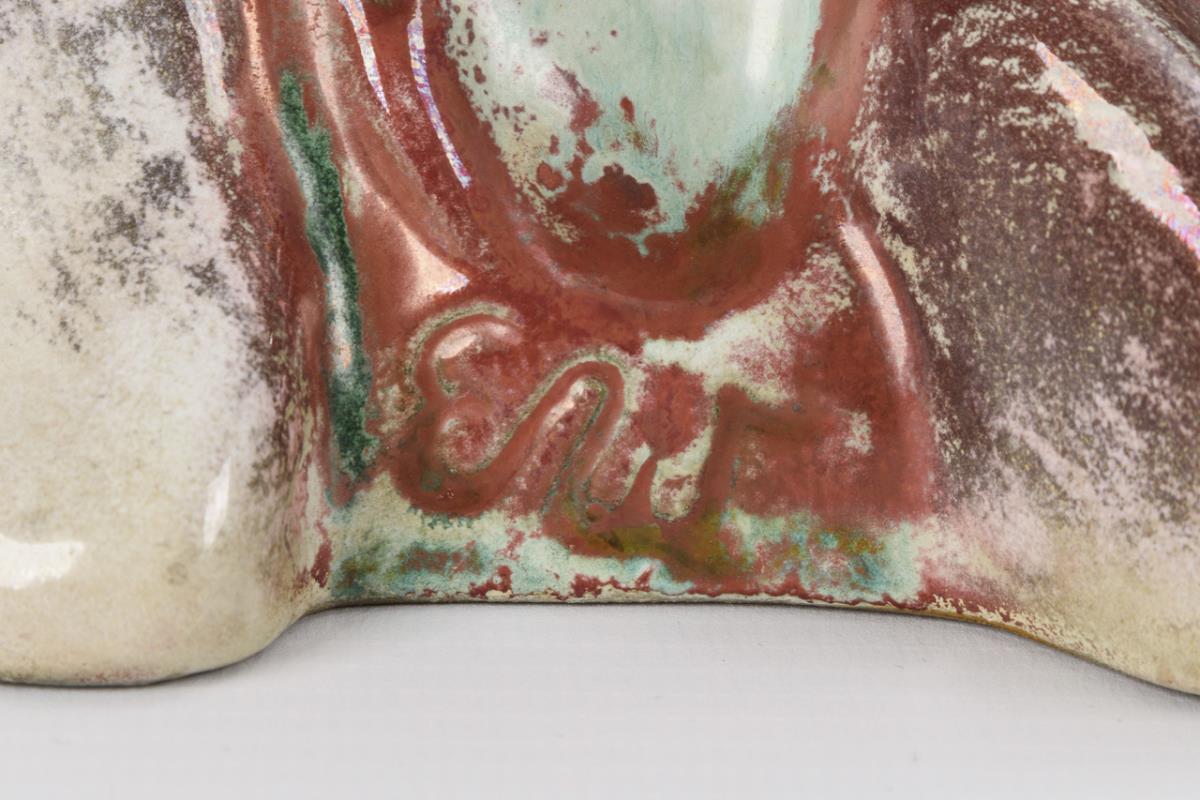 Grauer Tonscherben, weiße Engobe, Laufglasur in Rot und Grün. H 25 cm.