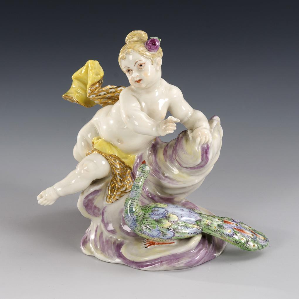 Kleine Plastik der auf einer Wolke sitzenden Juno sowie des neben ihr sitzenden Pfaus. Pfauenschopf fehlt, 1 Blatt der Haarblüte des Putto bestoßen.