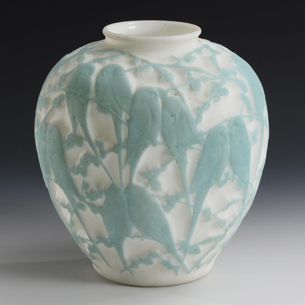 Milchglasvase mit Wellensittichrelief.