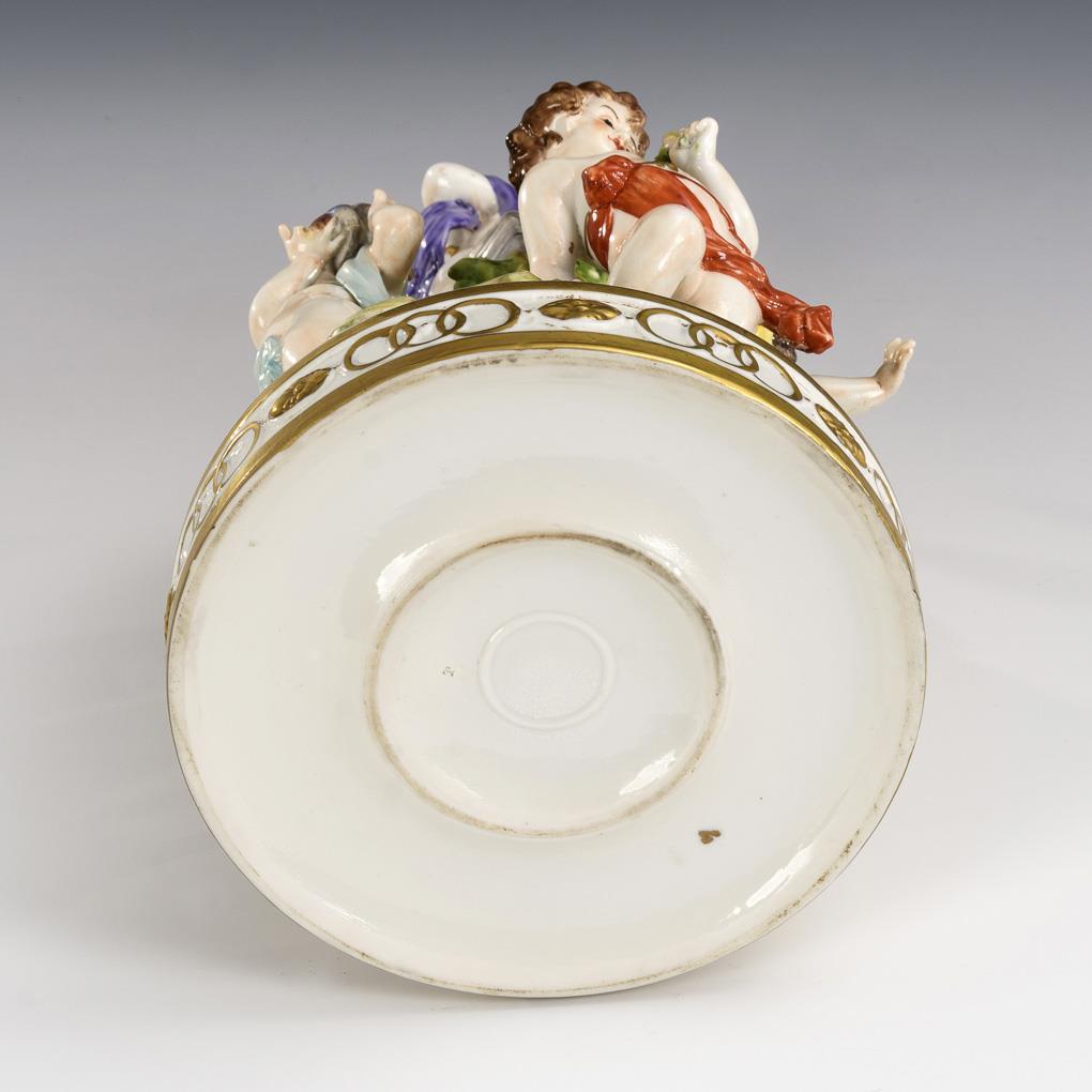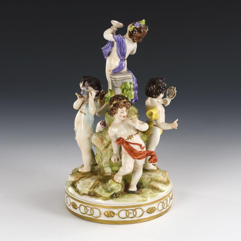Gruppe von fünf Putten mit Spiegel, Muschel, Trinkschale, Hornisse und Blume. Blüte und 1 Finger bestoßen.