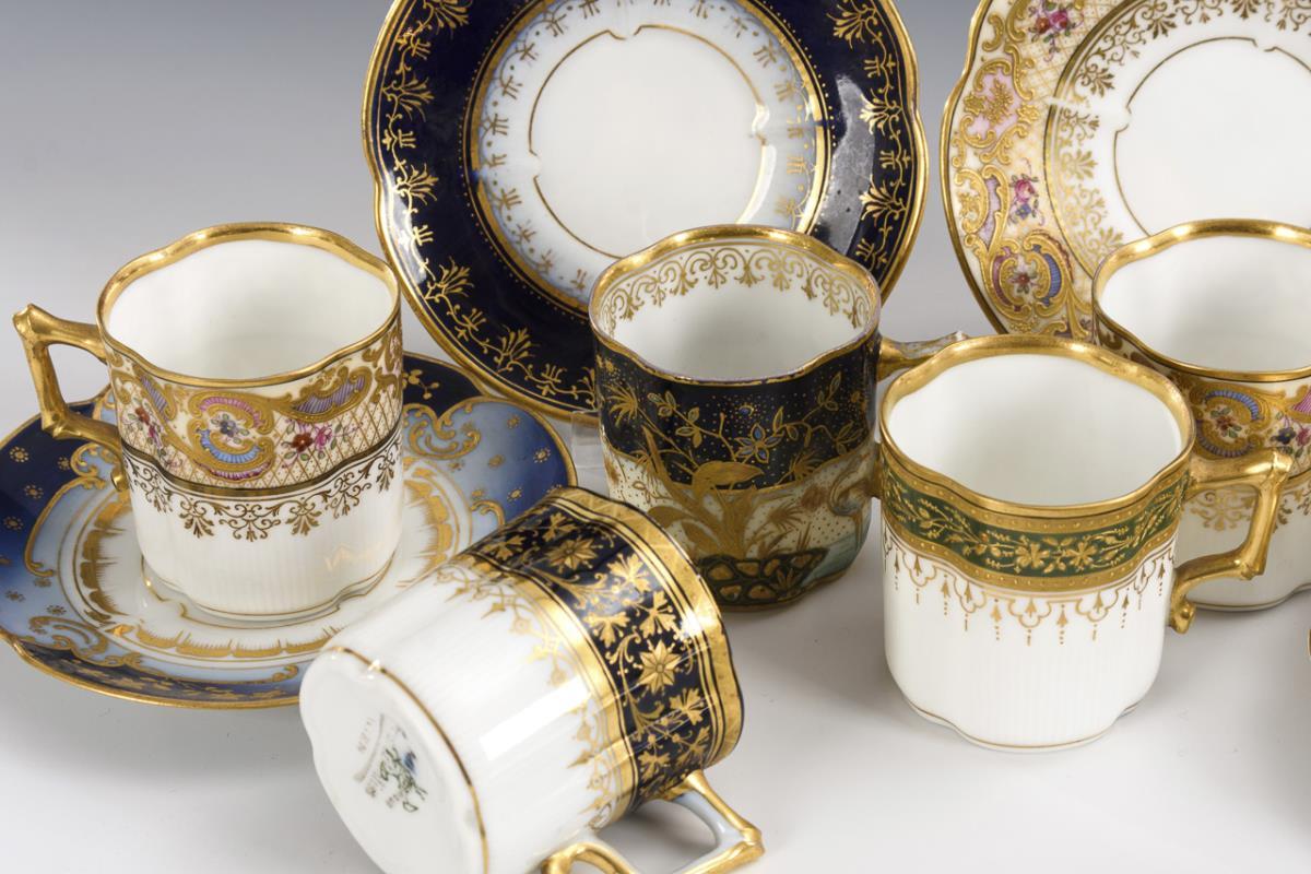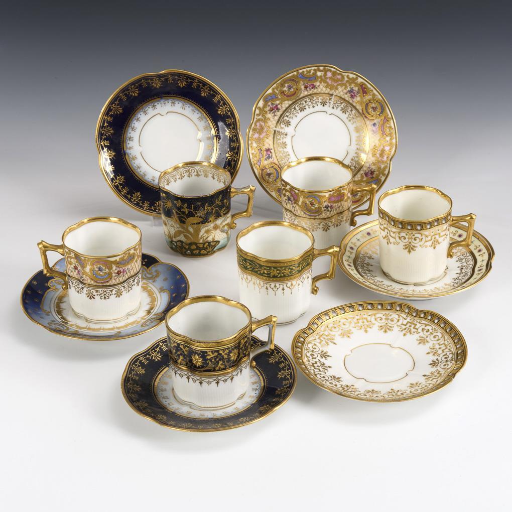 Vierpasstassen mit gewinkeltem Henkel und reicher, teils reliefierter floraler Goldmalerei, teils auf farbigen Fondbändern.