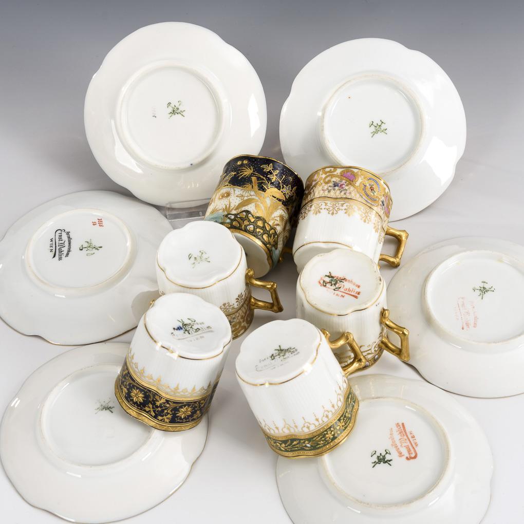 Polychrom bemalt, goldstaffiert. H Tassen 5,5 cm, Ø Untertassen 11 cm.