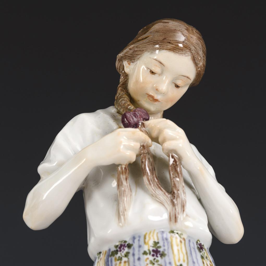Stehendes, sich einen Zopf flechtendes Mächen. Hals und Teil des Zopfes restauriert, Chip am Sockel, Zopfende minimal bestoßen.