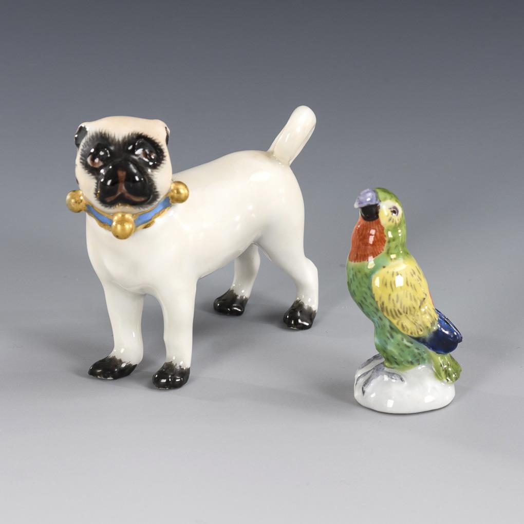 2 Miniaturtiere: Mops und Papagei. Meissen.