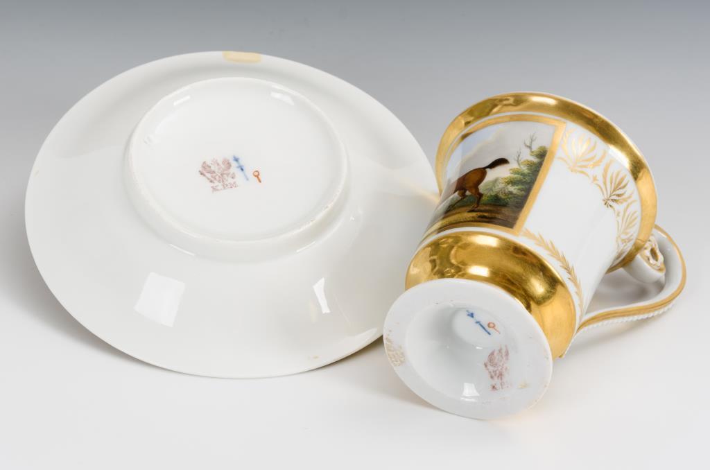 Gefußte Kratertasse mit Perlbandhenkel. Schauseitig eine Rechteckkartusche mit der Darstellung eines trabenden Pferdes in einer Landschaft, verso goldenes Blattband, innen vergoldet.
