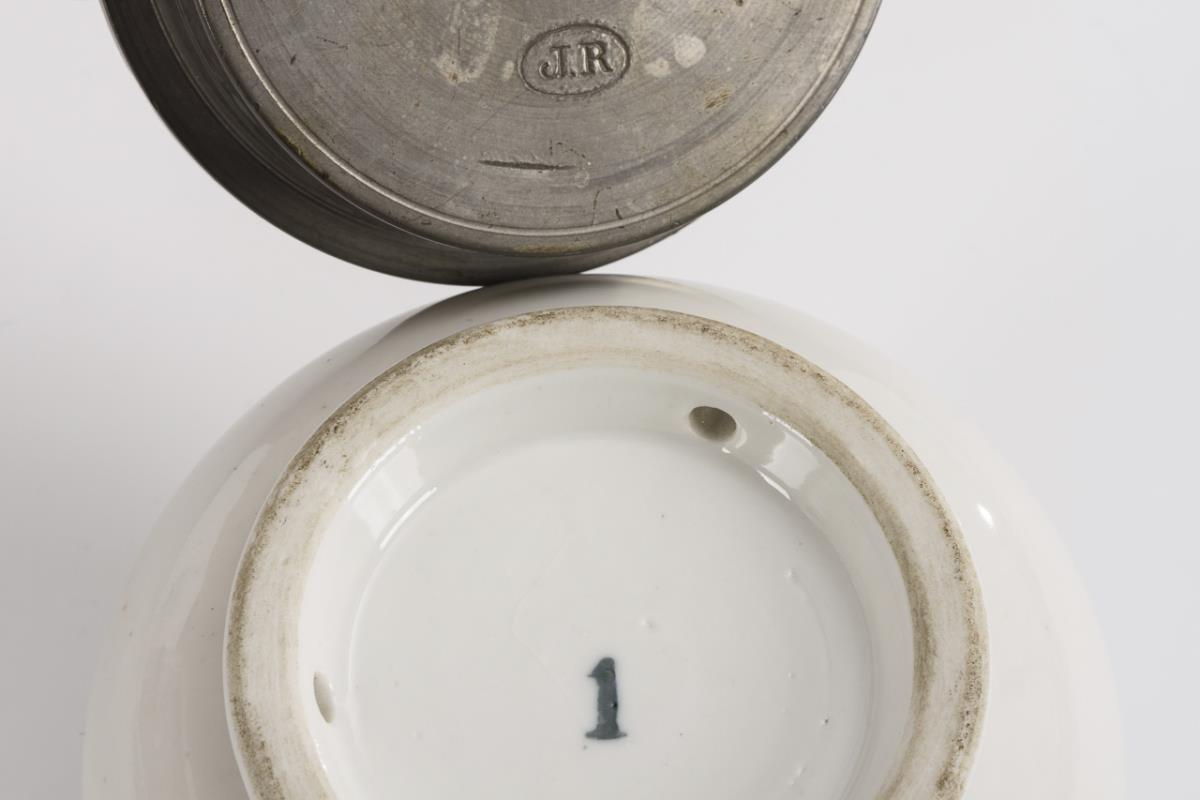 Starkwandiges Porzellangefäß mit Gewinde am Mündungsrand und Zinnschraubdeckel. Ausbruch am Mündungsrand.