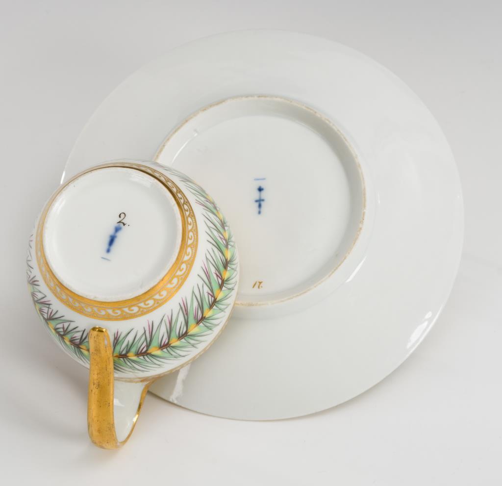 Polychrome Malerei, Goldstaffage.H Tasse 7 cm, Ø originale Untertasse 14 cm.