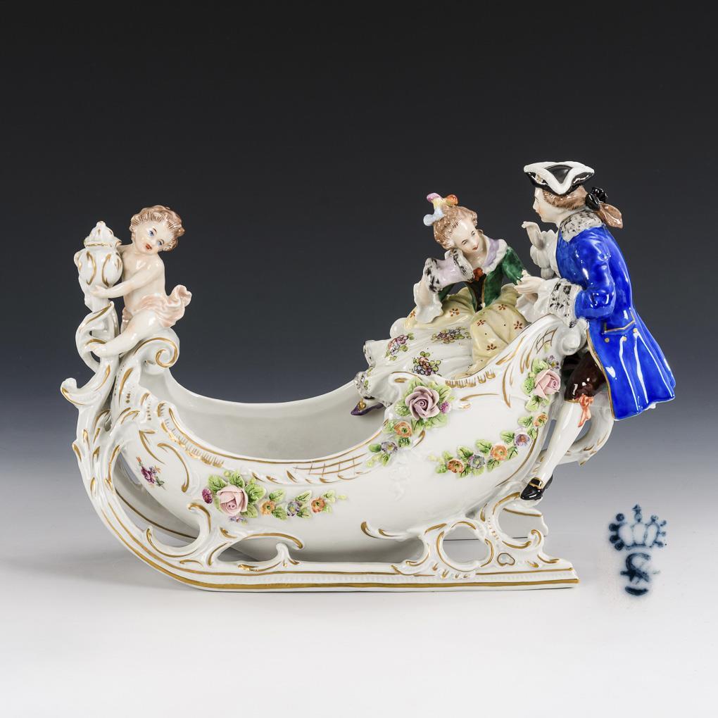 In Form eines Rokokoschlittens gestaltete Schale mit einem Rokokopaar sowie einem Putto.