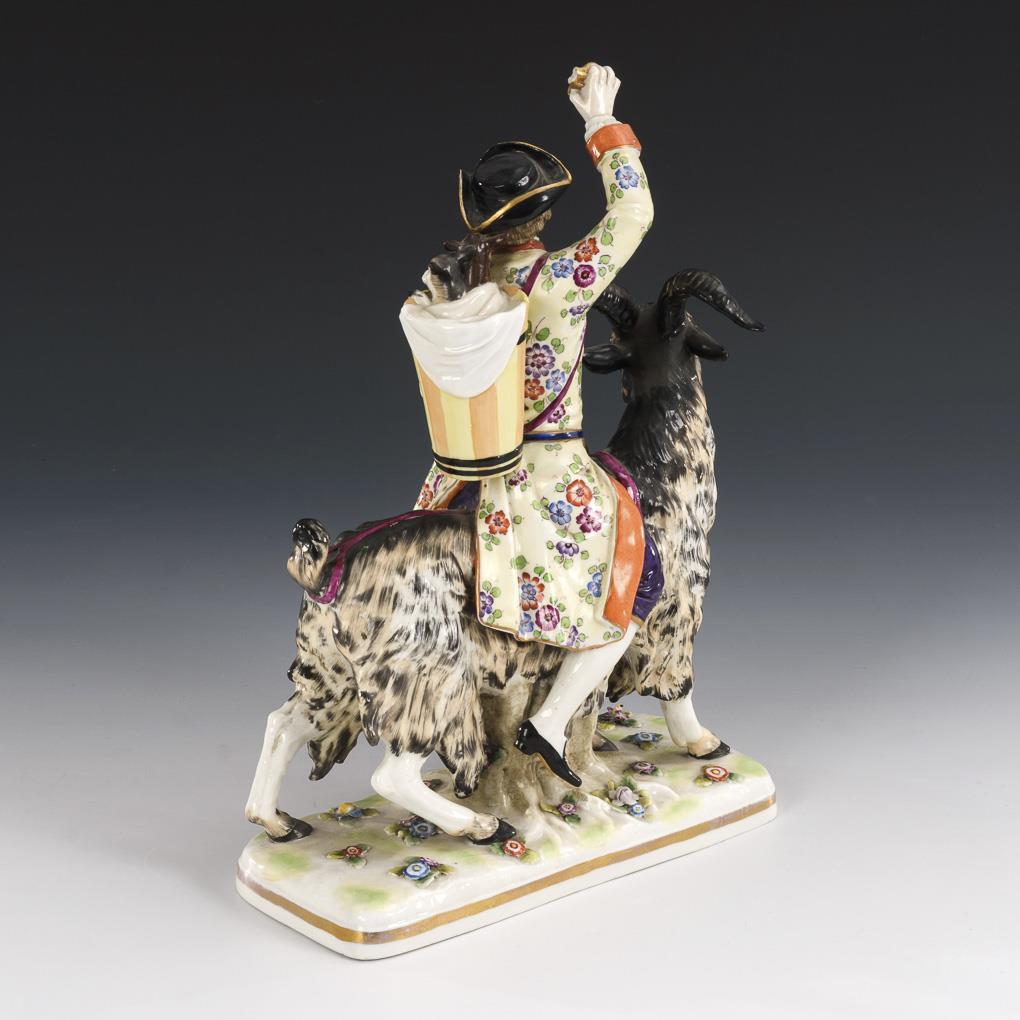 Auf einem Ziegenbock reitender Schneider mit zwei Zicklein in einer Kiepe. Partieller Goldabrieb, Schere und 1 Finger bestoßen.
