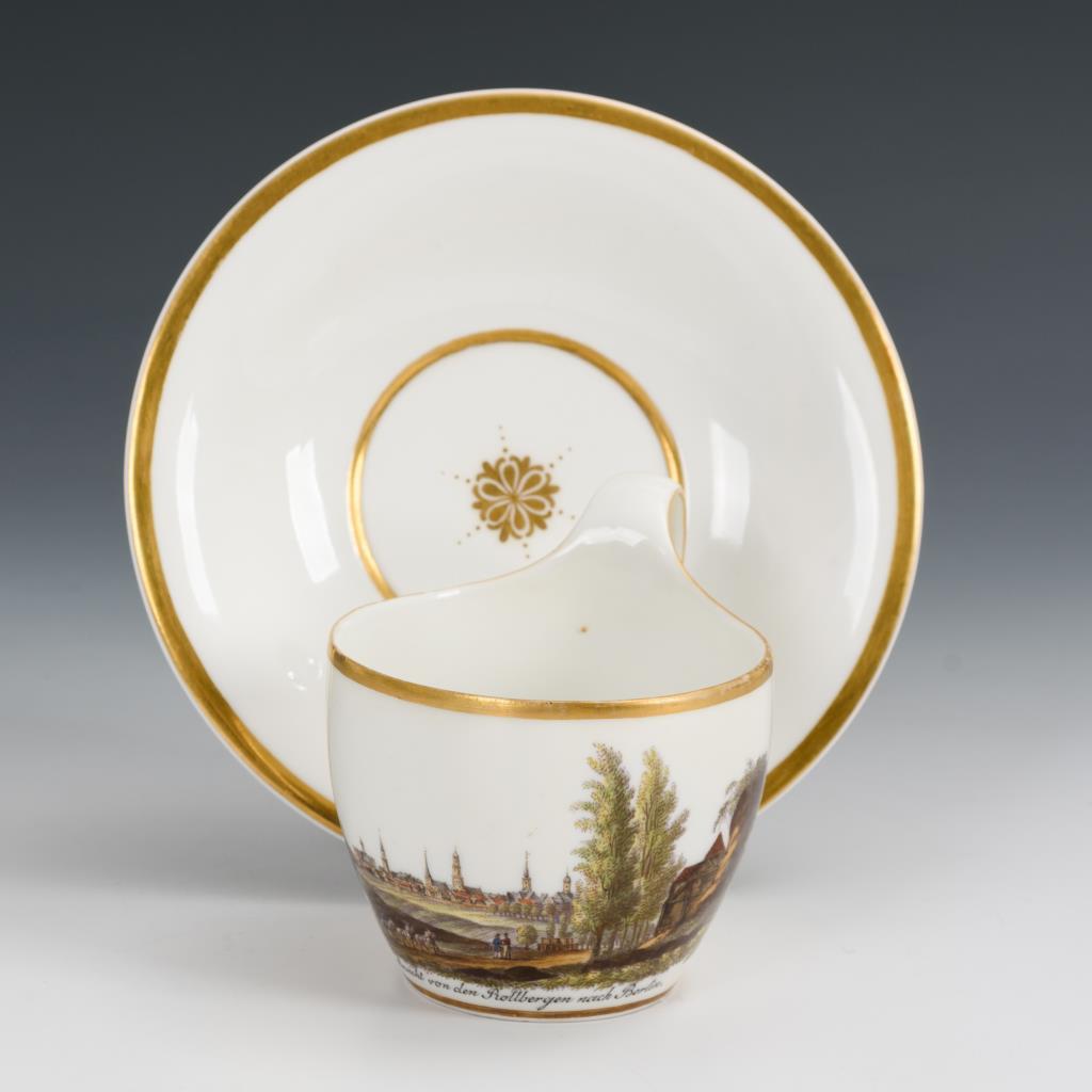 Campanertasse. Schauseitig die bezeichnete Ansicht der sogenannten Rollberge bei Berlin. Minimaler Goldabrieb am Tassenrand.