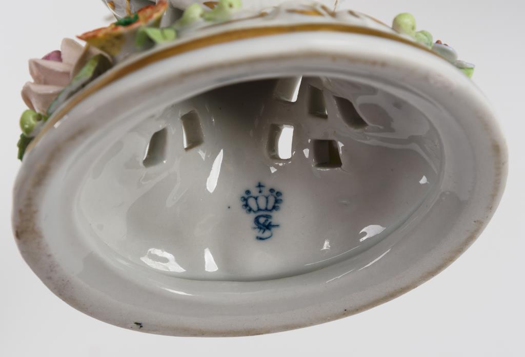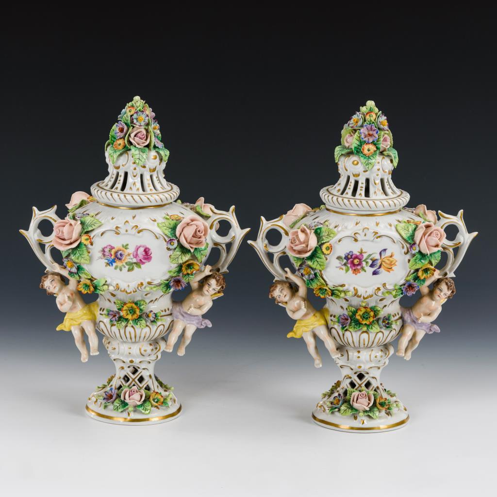 Balustervasen mit reichem Blütenbelag, je einem am Henkel schwebenden Putto und durchbrochenem Deckel mit Blütenbukett. Partiell Bestoßungen am Belag.