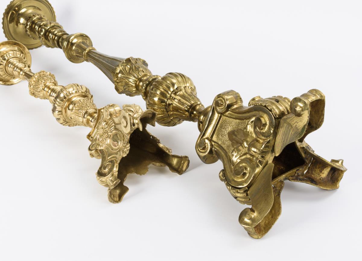 Reiche Blattzier an den großen Kerzenleuchtern mit 3-beinigem Sockel, Balusterschaft und Bronzedorn. Lackierung berieben.