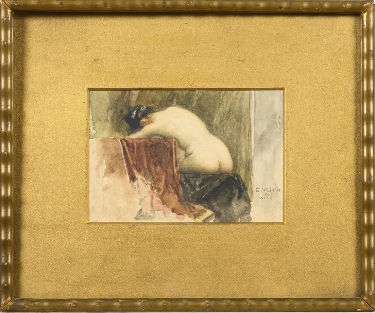 Aquarell. Rechts unten signiert/datiert: 1915 mit Zusatz Wien. Verso "Halbakt" betitelt mit Nr. 31, wohl ein Ausstellungs-Etikett von 1917 mit Nr. sowie Stempel "Von der Zentralstelle für Denkmalschutz zur Ausfuhr freigegeben".