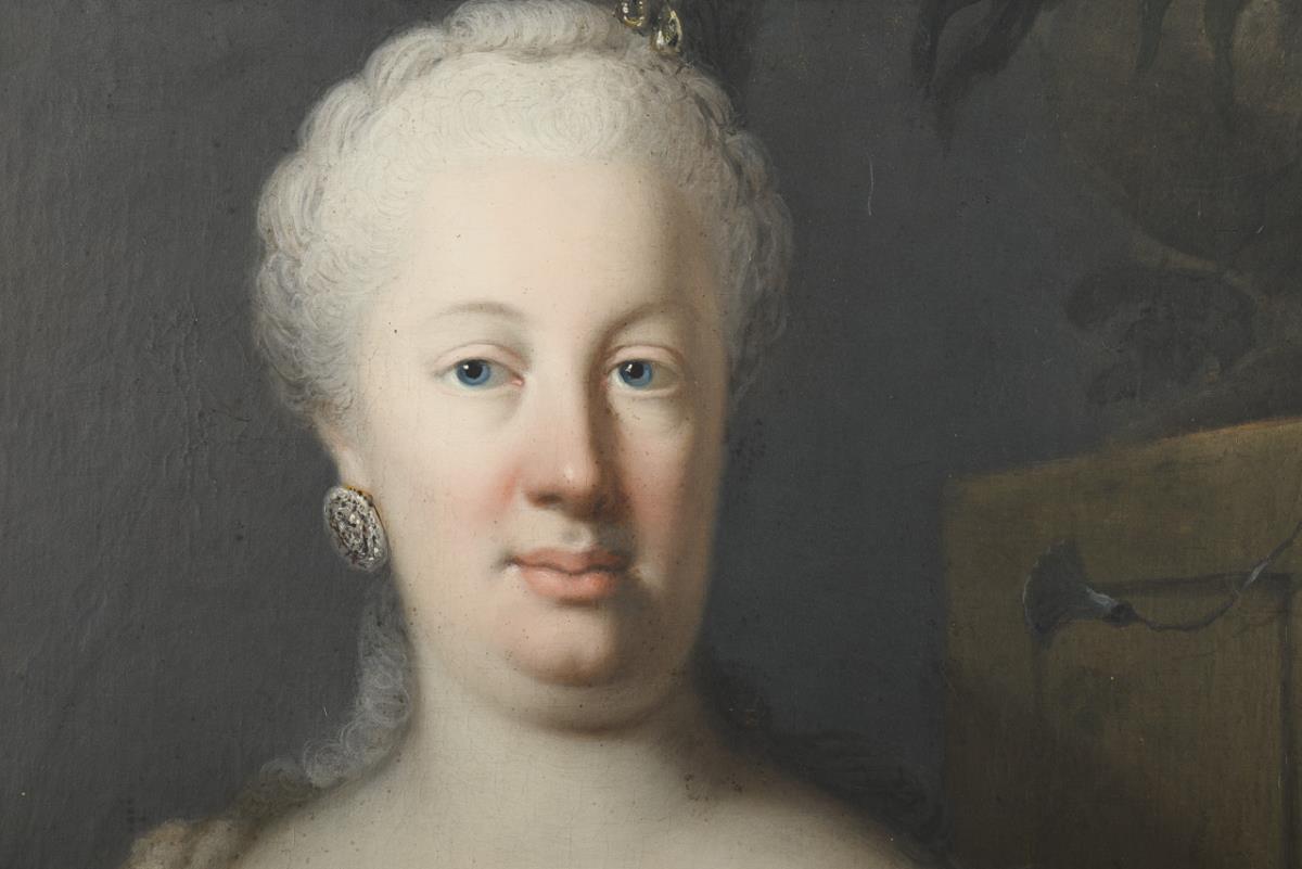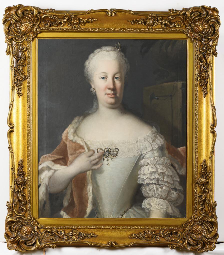 Porträt einer adligen Dame in weißem prunkvollen Kleid mit rotem Hermelinmantel und mit Edelstein besetztem Schmuck. Nachtrag 22.6.22: Es handelt sich um das Bildnis der Charlotte Amalie, Herzogin von Sachsen-Meiningen, geb. Prinzessin von Hessen-Philippsthal (1730 - 1801) wohl um 1770. Leinwand randdoubliert.