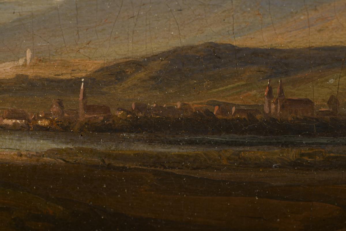 Staffagefigur am Waldrand unweit des Flusses mit der Stadt unter wolkigem Himmel. Leinwand doubliert.