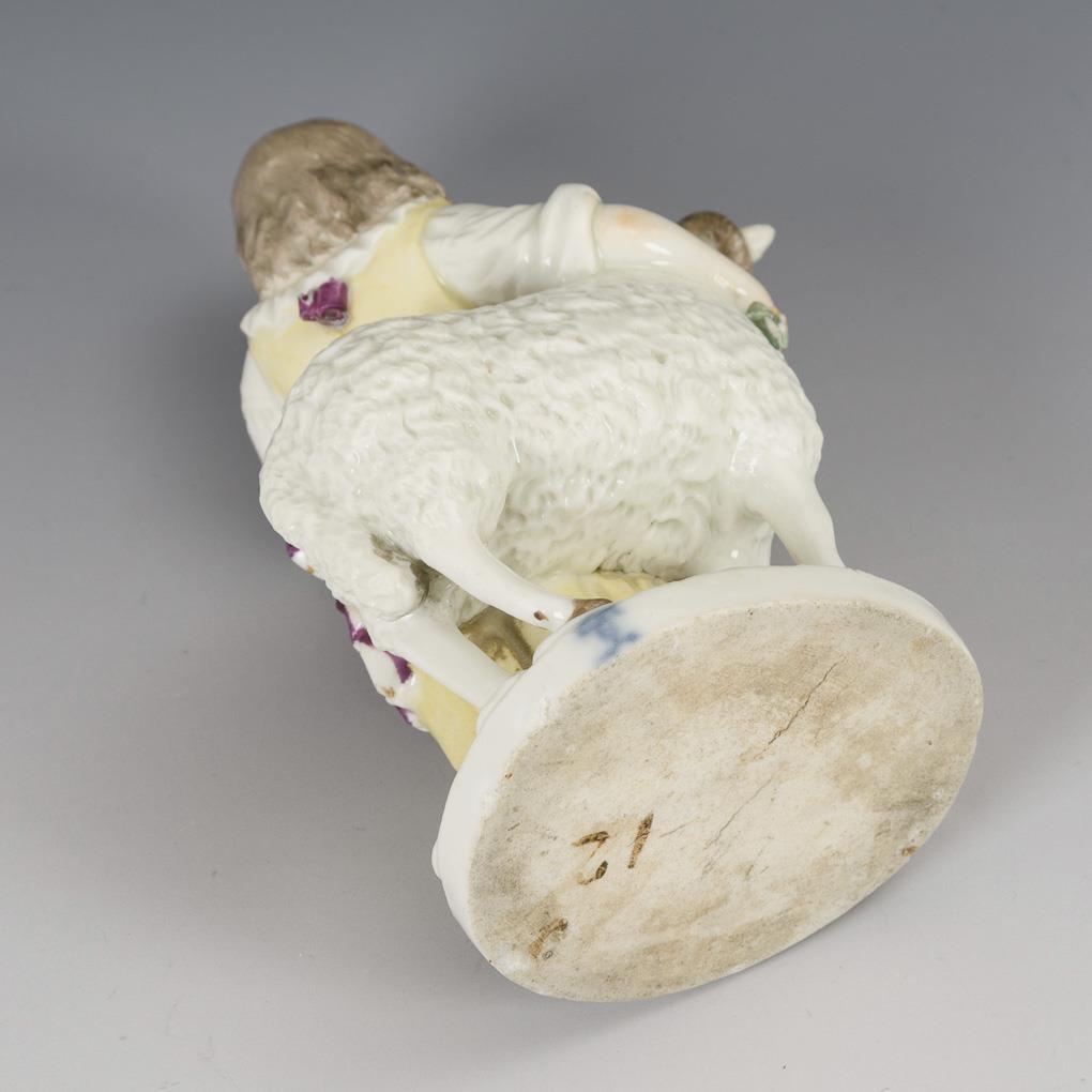 An einem Schafbock stehendes Mädchen mit Girlande. Bestoßungen an Sockelrand, Blättern und Schleifen.