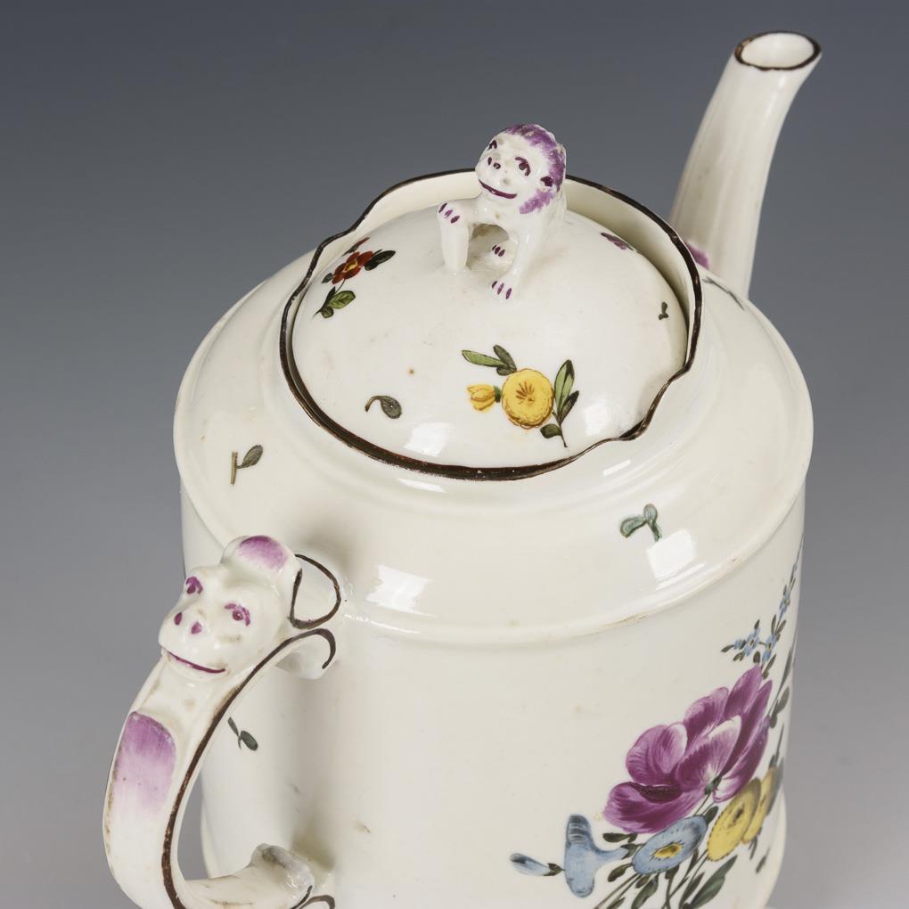 Zylinderkanne mit drei Tatzenfüßen, Löwenkopfhenkel und Deckel mit Löwenknauf. Mit Blumenmalerei und braunen Rändern. Restauriert.