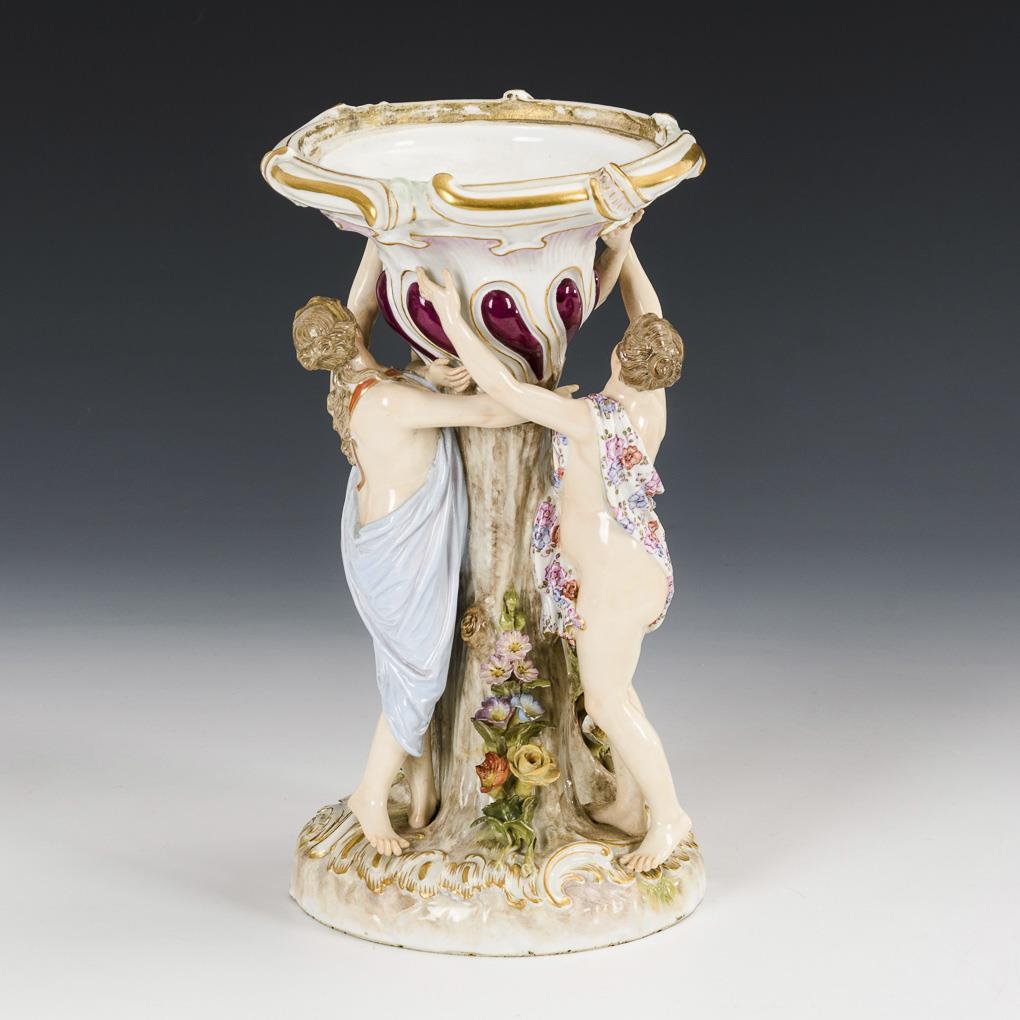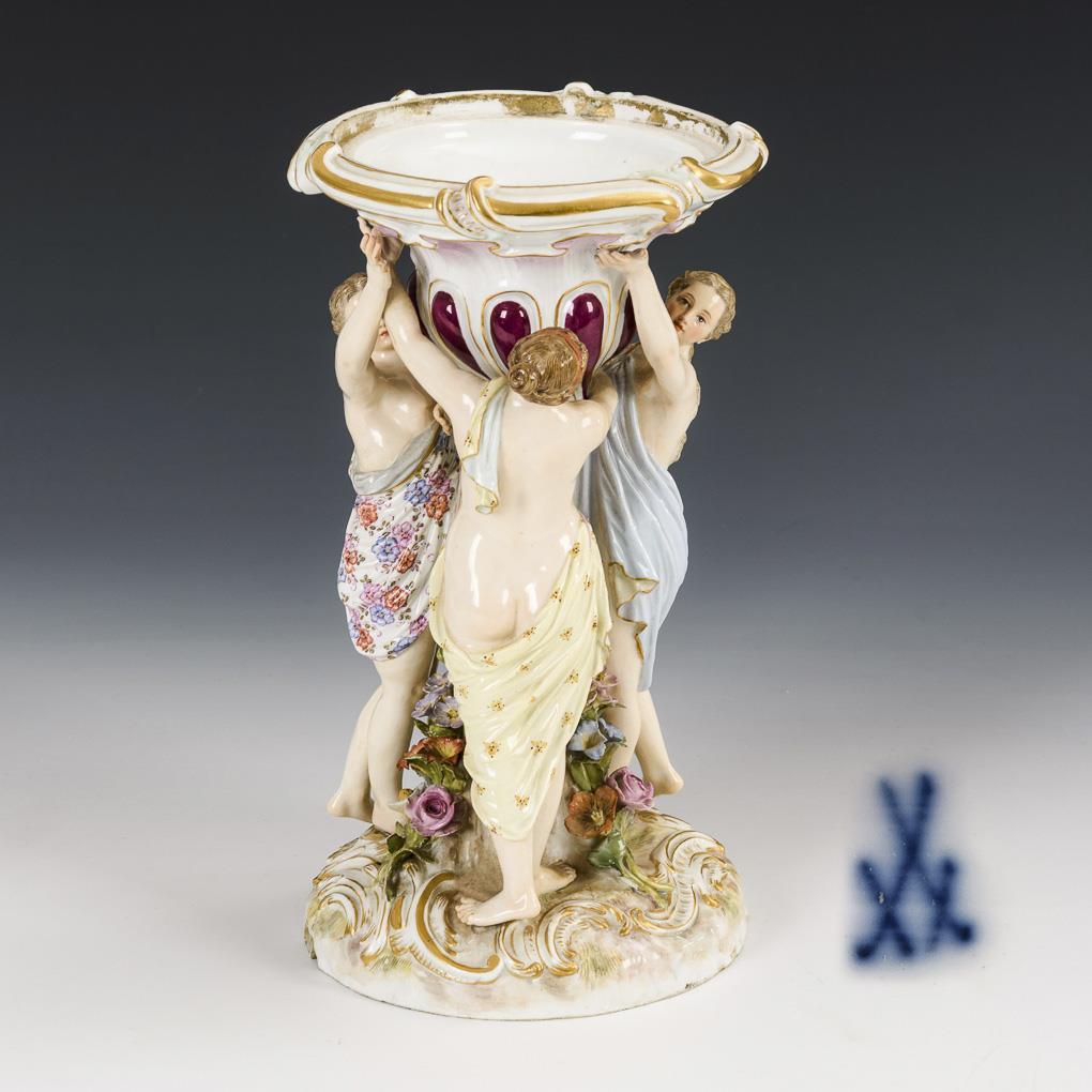 Drei an einem Baumstamm stehende Grazien mit erhobenen Armen. Schale fehlt, Bestoßung am Stand und an den Blüten, 1 Finger bestoßen.