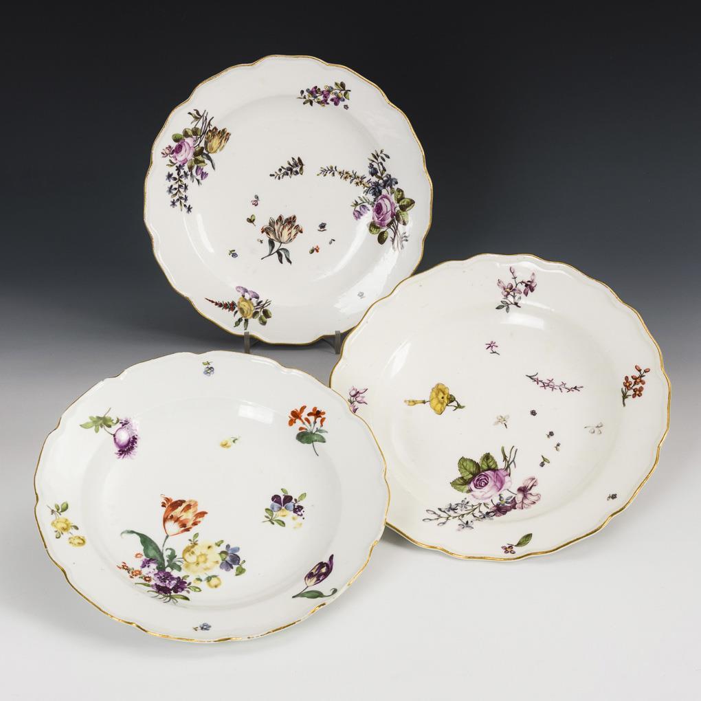 Speiseteller mit mehrpassigem Rand. Partiell berieben, 2 Teller mit Restaurierung an der Fahne, 1x mit Randbestoßung.