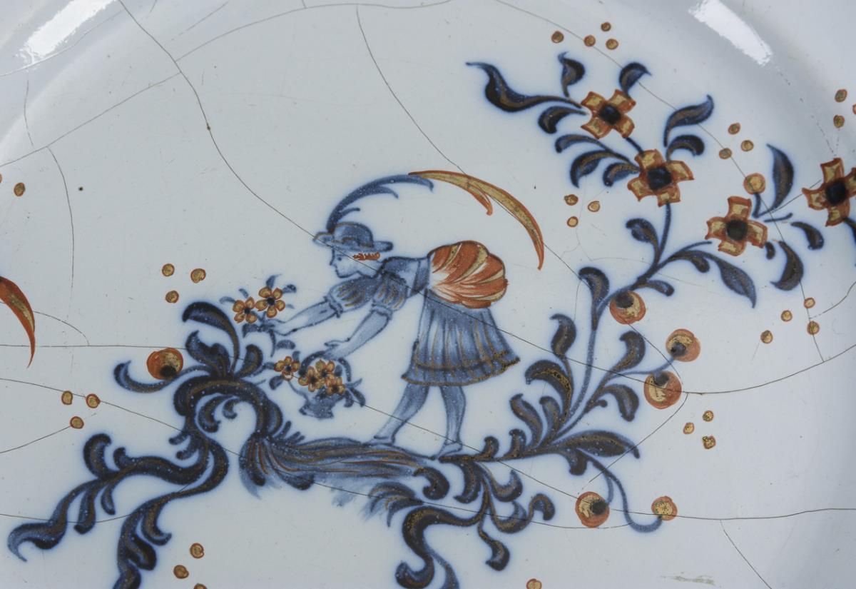 Runder Teller mit geschweiftem Rand. Im Spiegel eine asiatisierende Figurendarstellung, umgeben von einem Insekt und Blütendekor. Imitierte (geritzte) Glasurrisse. Partiell Bestoßungen.