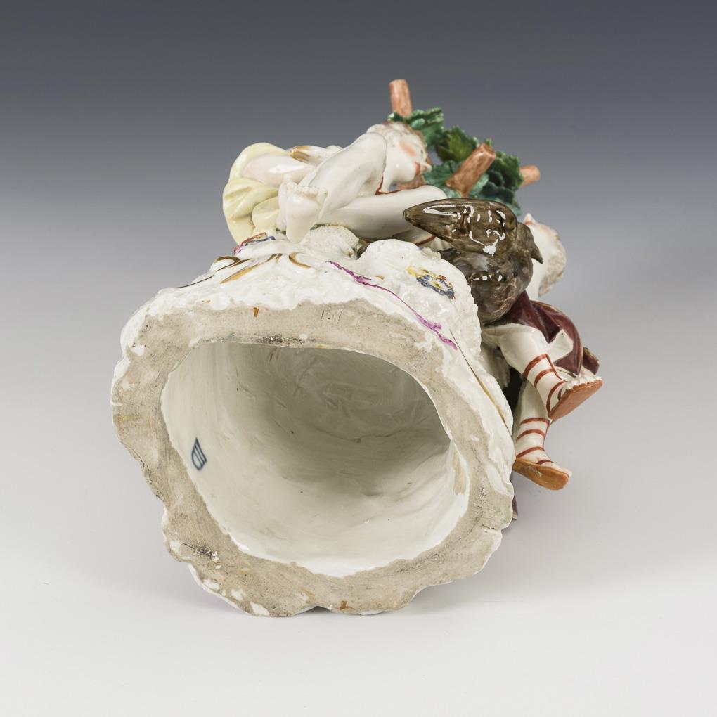 Vor einem Baumstamm sitzendes Paar der Jagdgöttin Diana und des Zeus mit Krone und Adler. Stamm mit Blättern, rechter Fuß der Diana und Flügel des Adlers restauriert.