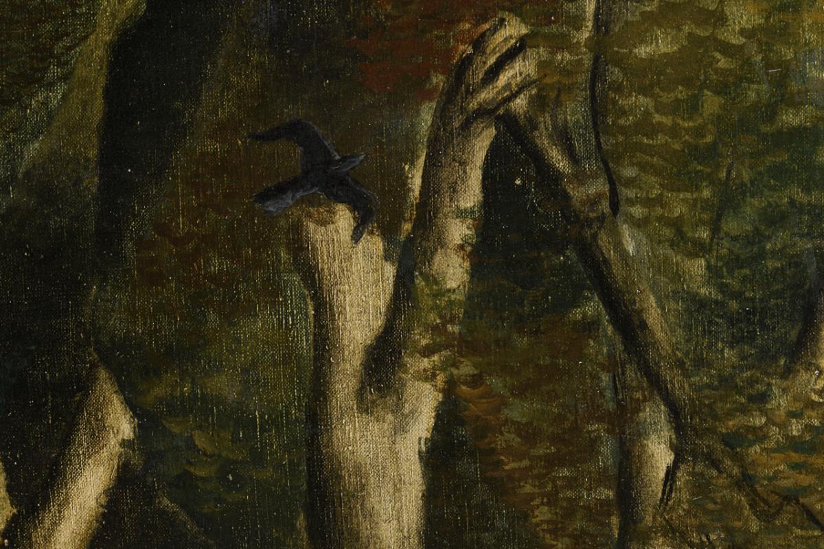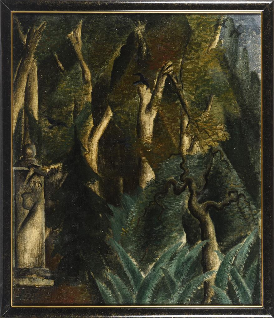 Abstrakte Landschaft mit Säule und schwarzen Vögeln. Minimale Altersspuren.