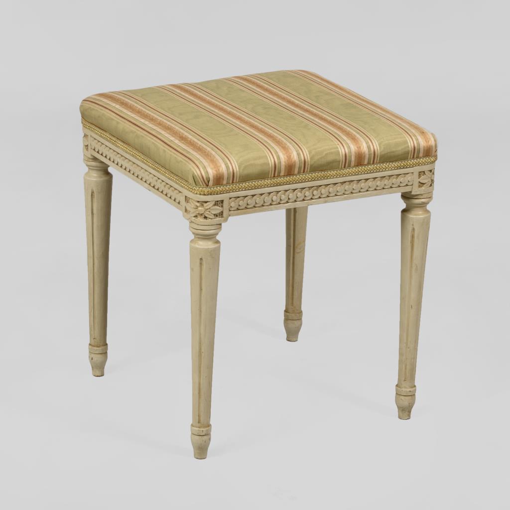 Würfelförmiger Hocker mit antikisierendem Dekor und konischen Beinen mit Kanneluren; Polster mit grün-gestreiftem Bezug. Alters-/Gebrauchsspuren.