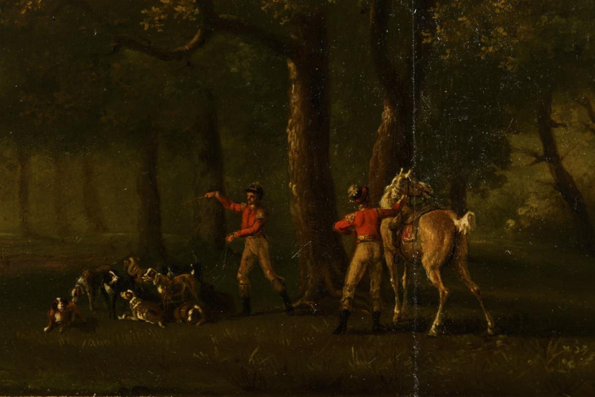 Die Reiter mit den Hunden am Waldrand unter leicht bewölktem Himmel. Restauriert.