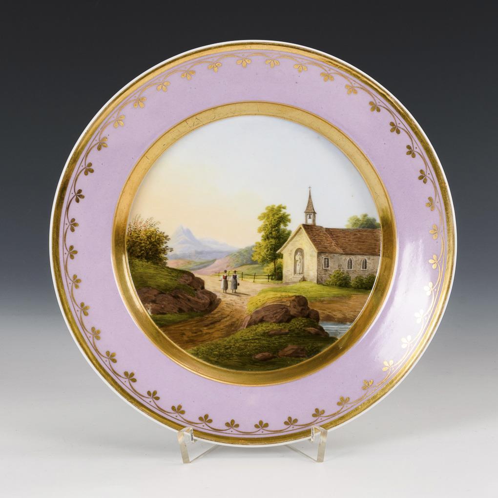Teller mit rosafarbener Fahne und floraler Goldbordüre. Im Spiegel die Darstellung einer Alpenlandschaft mit Kirche und Figurenstaffage. Minimale Bereibung an der Malerei.
